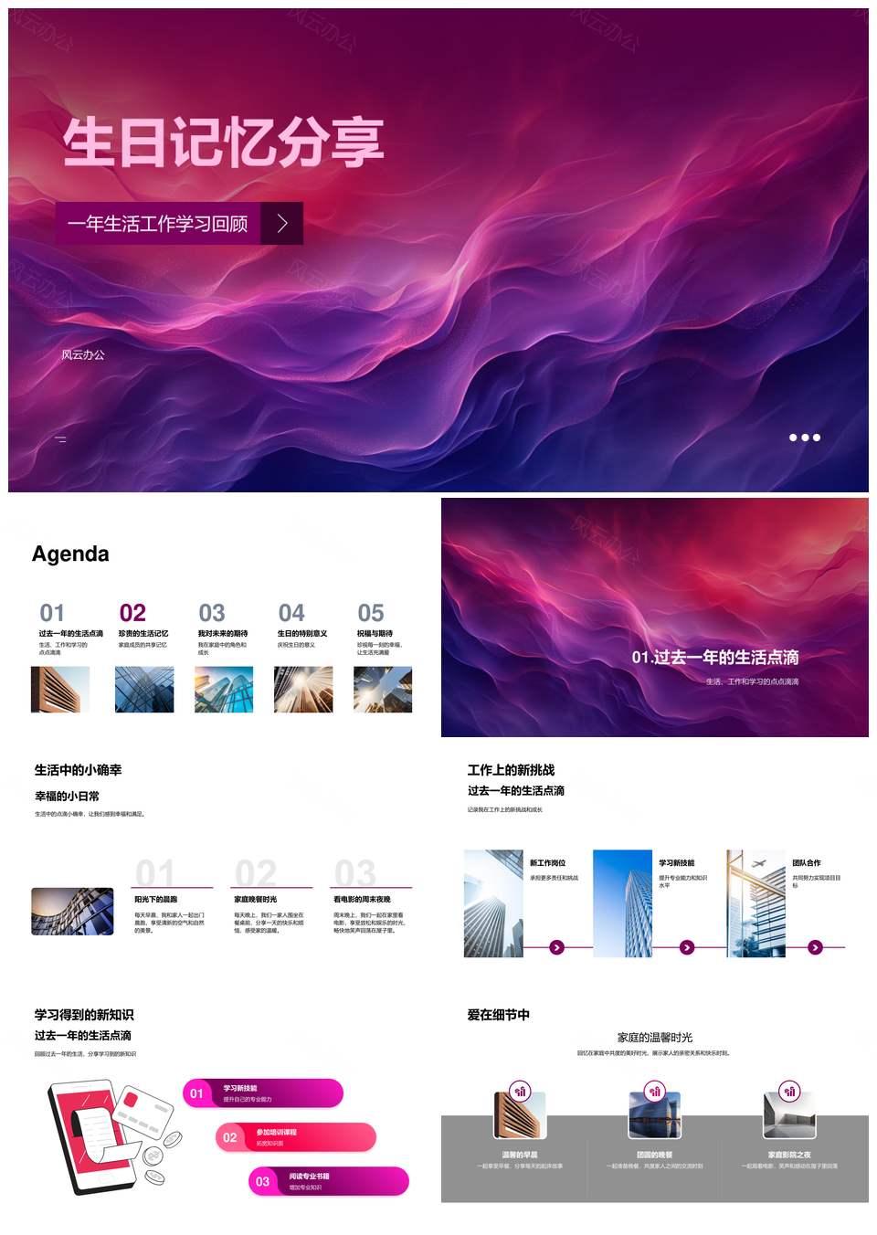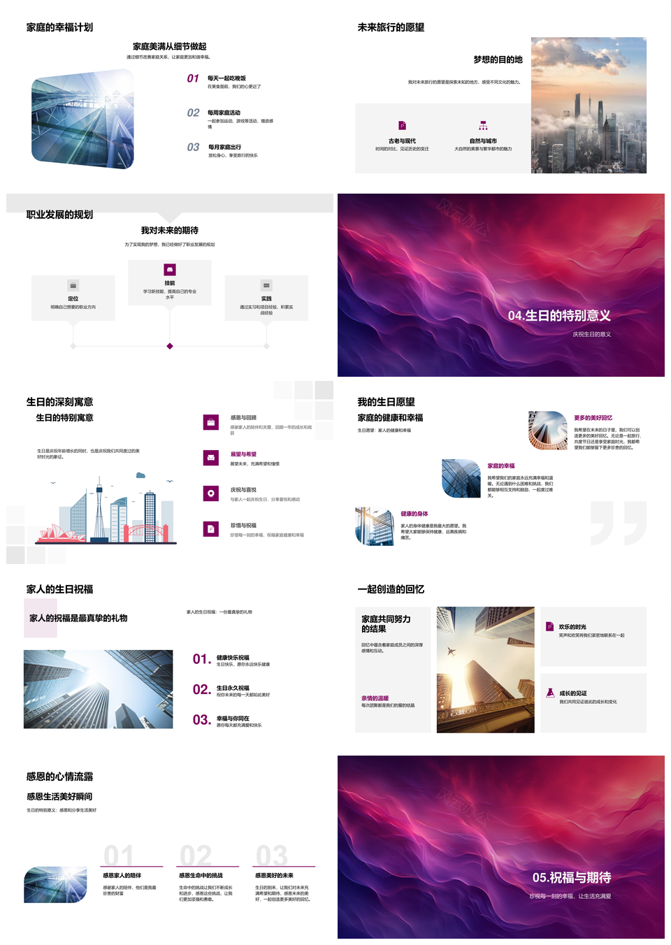 风云办公提供的家庭生日记忆幸福健康目标旅行共创PPT模板,下载格式为pptx,一共33页,作品中文字及图均可以修改和编辑,图片更改请在作品中右键图片并更换,文字修改请直接点击文字进行修改。