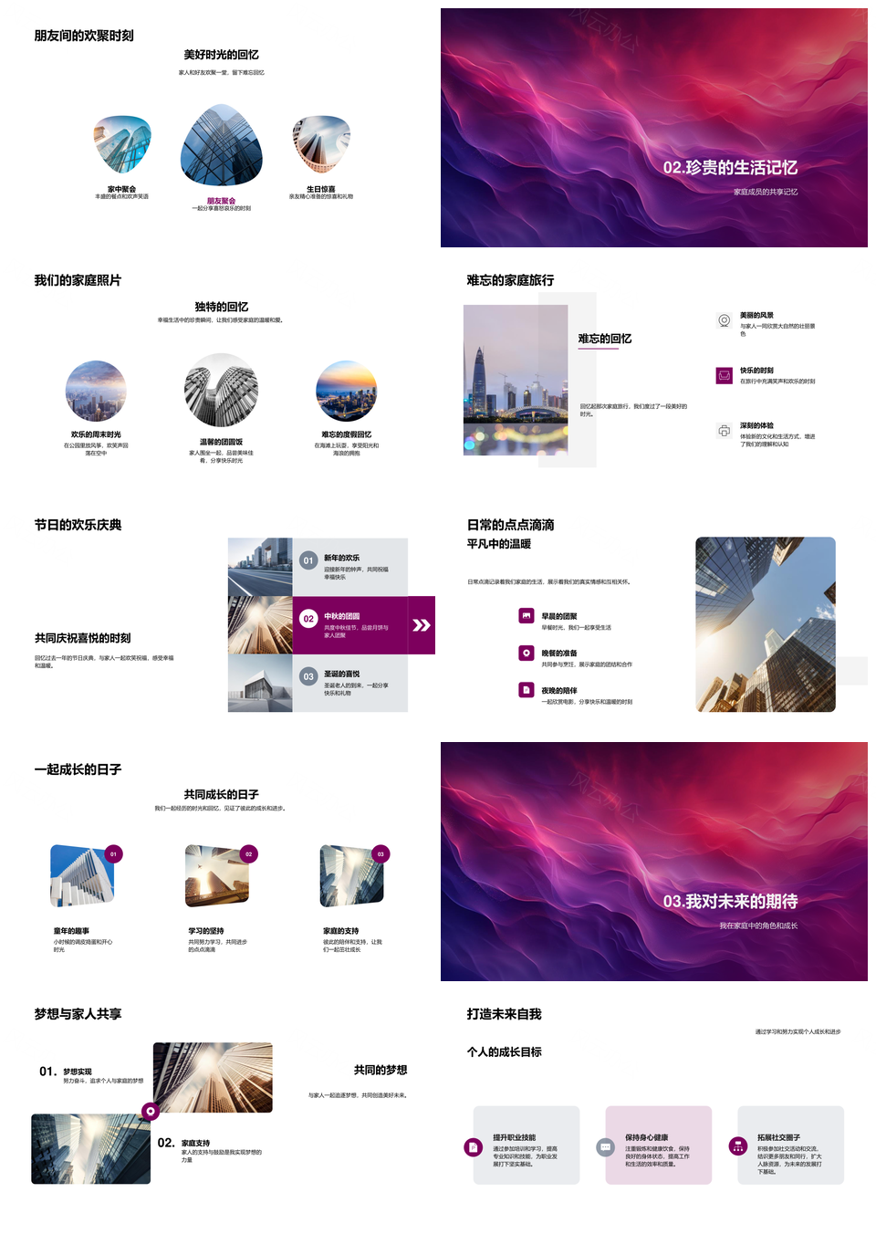 这是一张家庭生日记忆幸福健康目标旅行共创PPT模板,包含家庭、生日、记忆、幸福、健康、目标、旅行、共创等主题内容,也可用作家庭生日记忆幸福、家庭幸福健康目标、健康目标旅行共创、幸福健康目标旅行、家庭生日旅行共创、家庭记忆幸福健康、生日幸福健康目标、生日目标旅行共创、记忆健康目标旅行、家庭健康目标旅行、幸福目标旅行共创、家庭生日健康目标、家庭幸福旅行共创、生日记忆幸福健康、家庭健康目标共创等PPT场景使用。