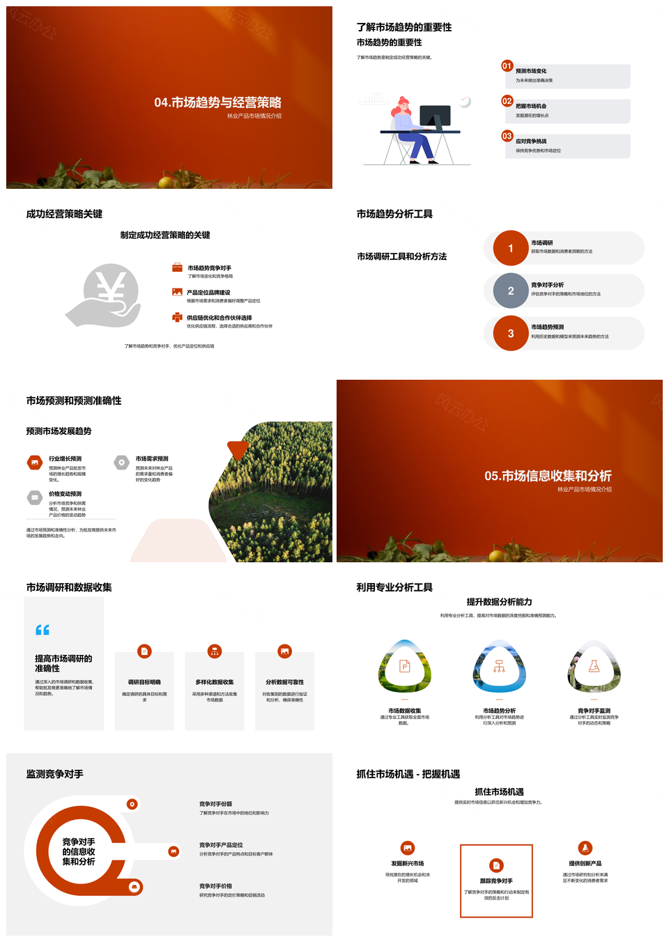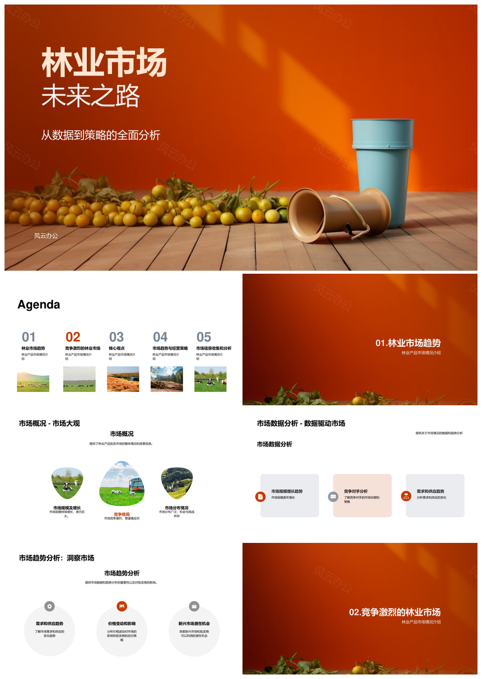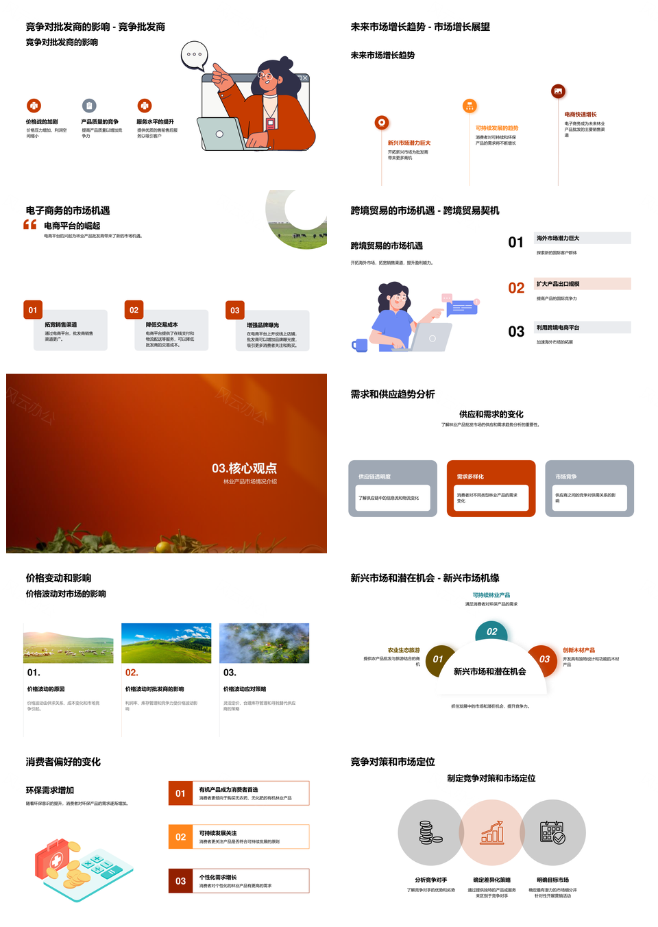 风云办公提供的林业产品批发市场趋势机遇竞争分析PPT模板,下载格式为pptx,一共29页,作品中文字及图均可以修改和编辑,图片更改请在作品中右键图片并更换,文字修改请直接点击文字进行修改。