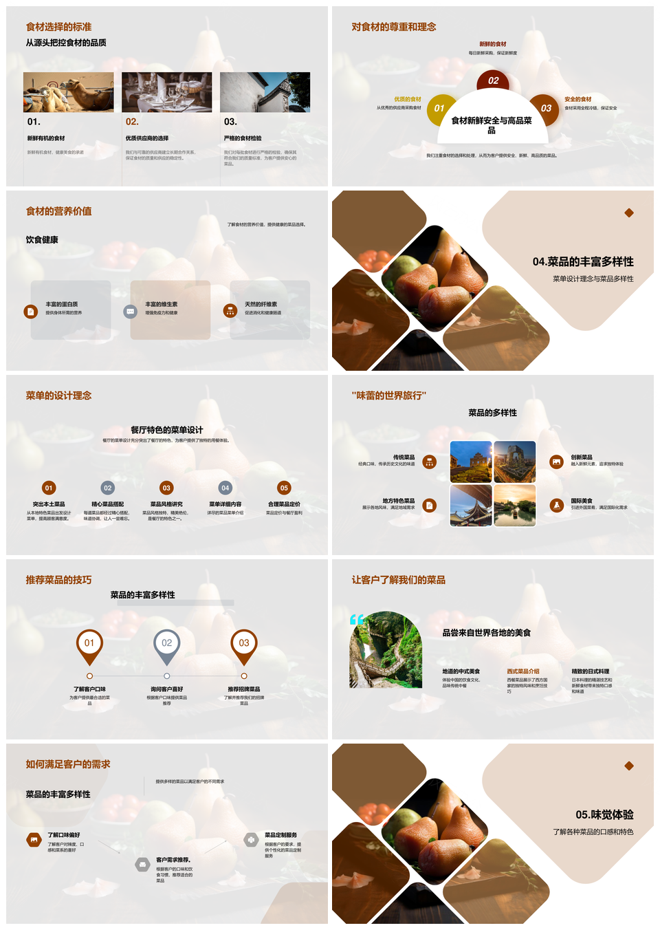 风云办公提供的招牌美食匠心艺境故事菜单口感体验PPT模板,下载格式为pptx,一共33页,作品中文字及图均可以修改和编辑,图片更改请在作品中右键图片并更换,文字修改请直接点击文字进行修改。