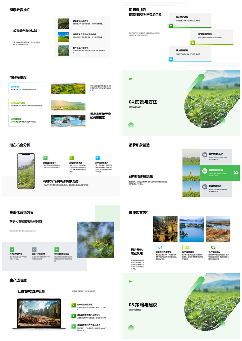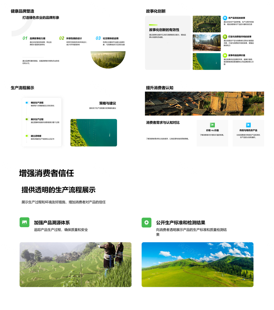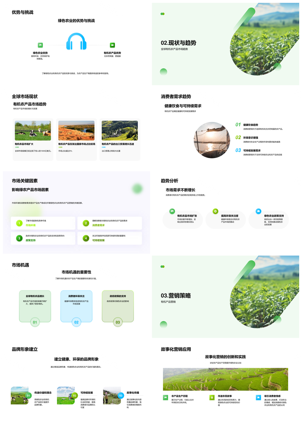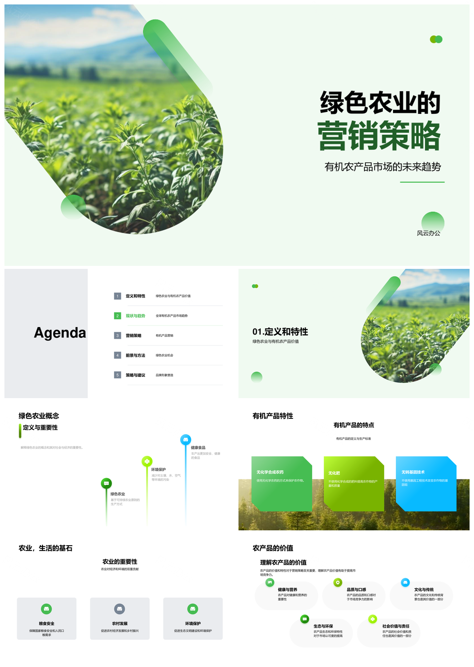 风云办公提供的绿色农业有机产品营销策略与品牌故事PPT模板,下载格式为pptx,一共33页,作品中文字及图均可以修改和编辑,图片更改请在作品中右键图片并更换,文字修改请直接点击文字进行修改。