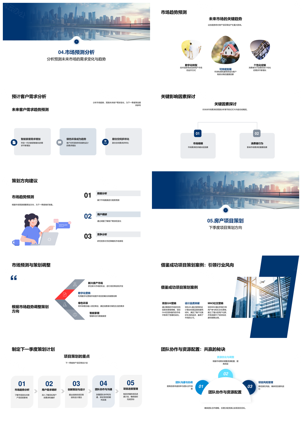 风云办公提供的房产项目策划季度总结与市场预测PPT模板,下载格式为pptx,一共28页,作品中文字及图均可以修改和编辑,图片更改请在作品中右键图片并更换,文字修改请直接点击文字进行修改。