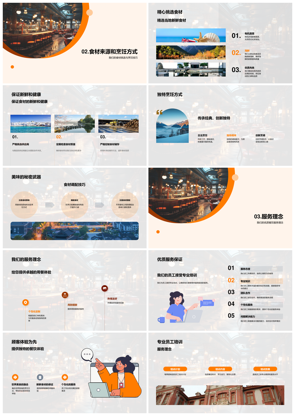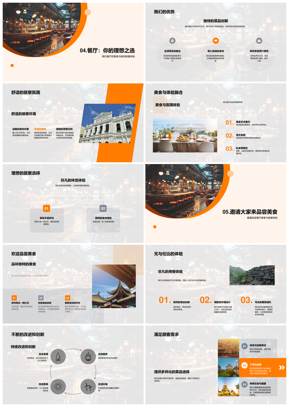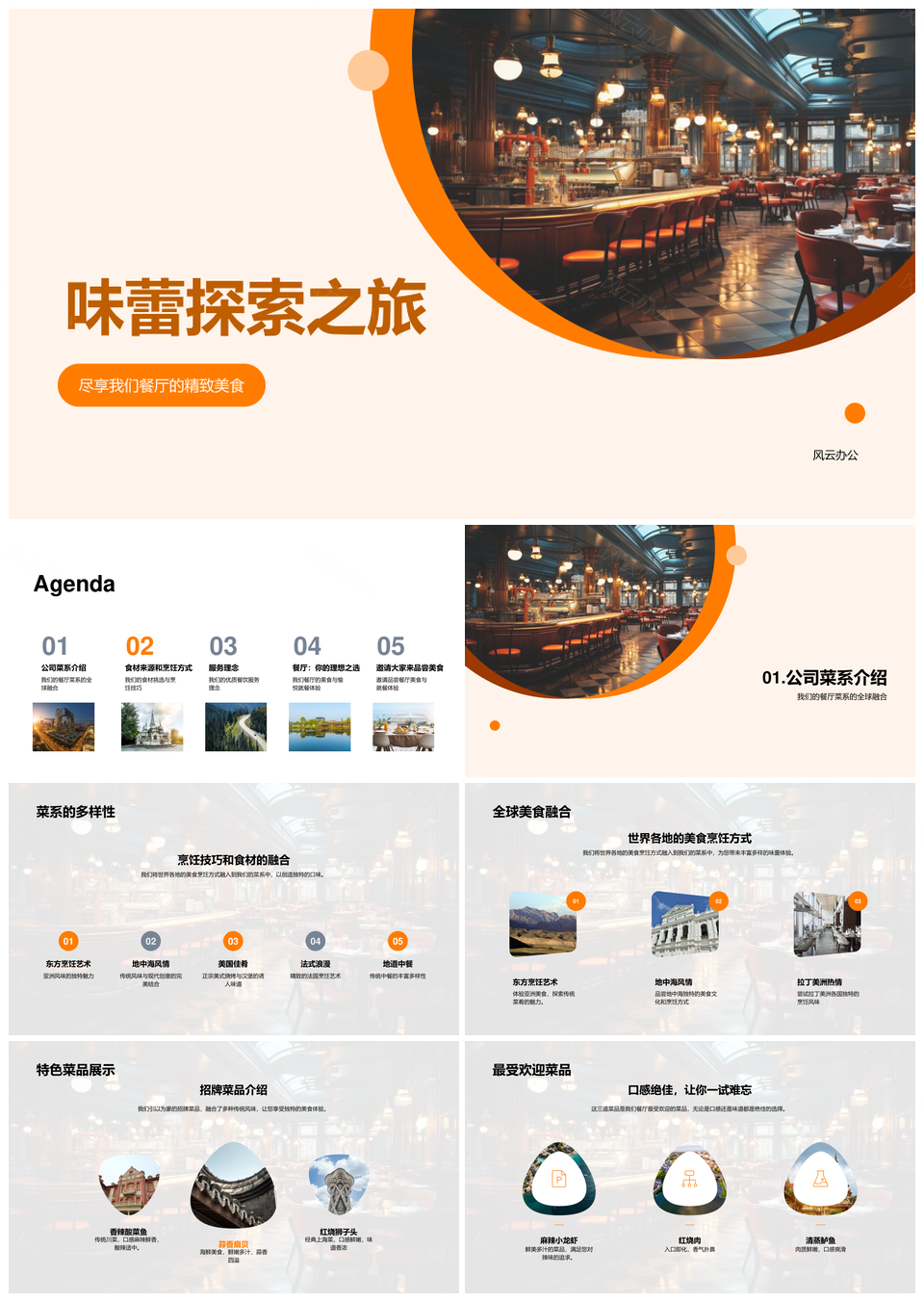 风云办公提供的鲜食烹艺多样菜系精致餐厅寻味之旅PPT模板,下载格式为pptx,一共28页,作品中文字及图均可以修改和编辑,图片更改请在作品中右键图片并更换,文字修改请直接点击文字进行修改。