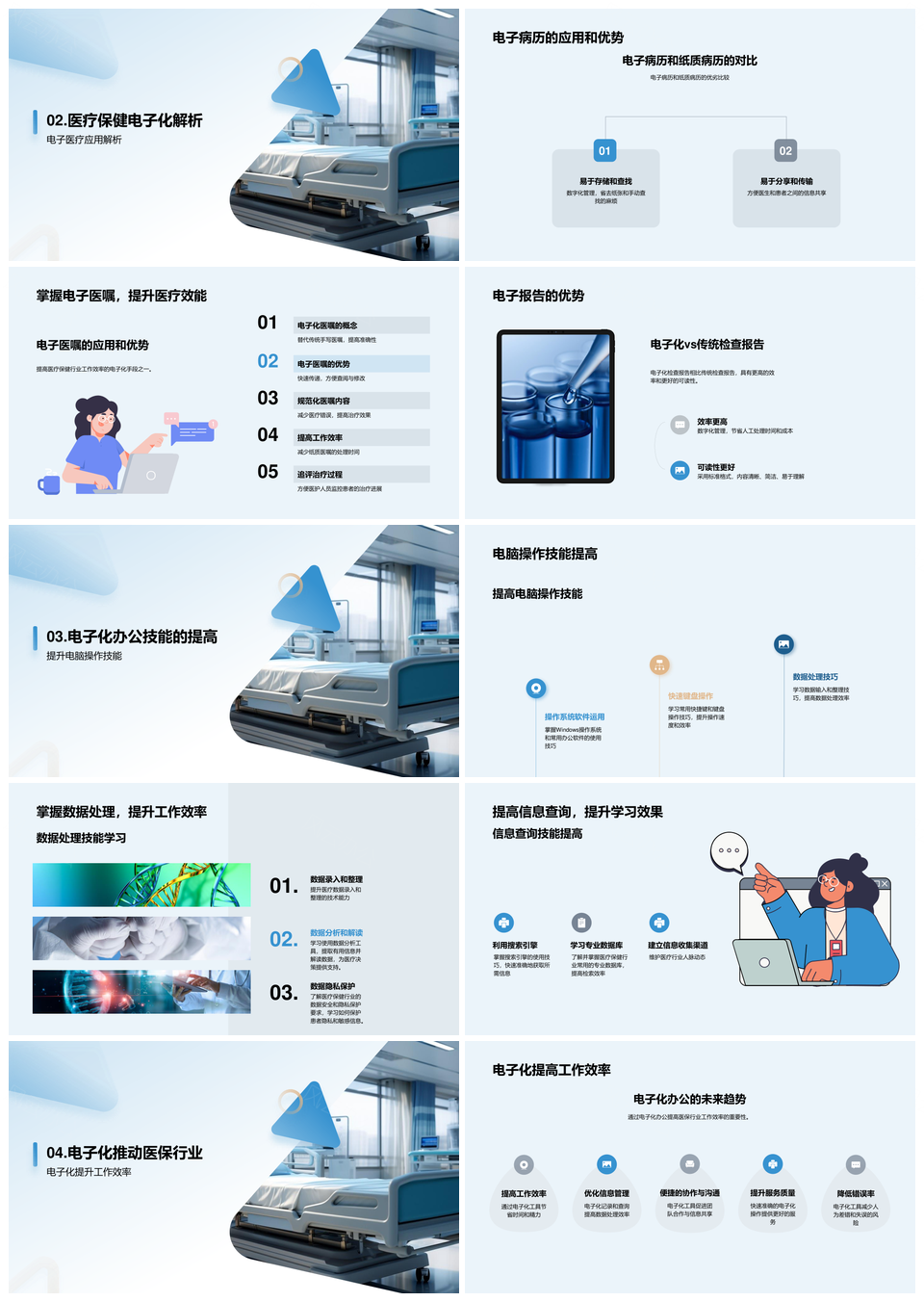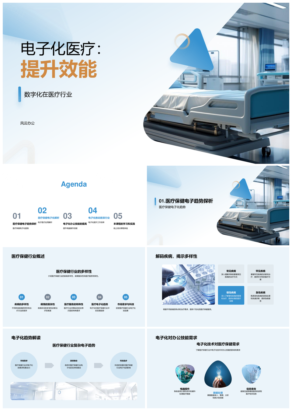风云办公提供的医疗电子化趋势提升行业效能PPT模板,下载格式为pptx,一共24页,作品中文字及图均可以修改和编辑,图片更改请在作品中右键图片并更换,文字修改请直接点击文字进行修改。