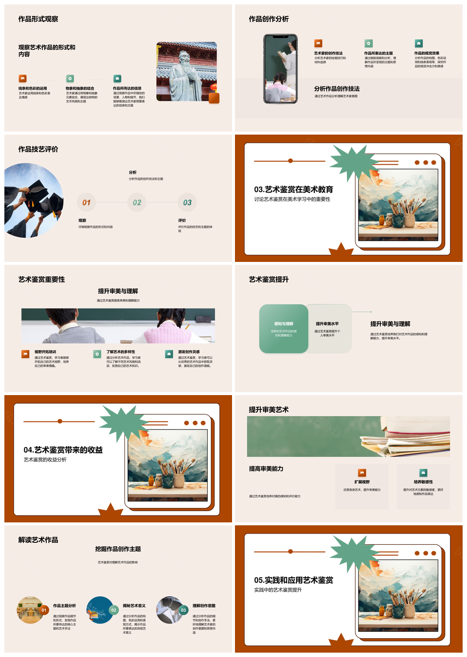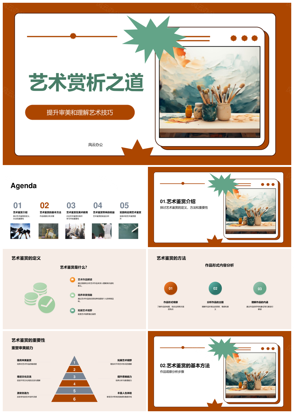 风云办公提供的艺术鉴赏画笔技巧与审美教育方法分析PPT模板,下载格式为pptx,一共20页,作品中文字及图均可以修改和编辑,图片更改请在作品中右键图片并更换,文字修改请直接点击文字进行修改。