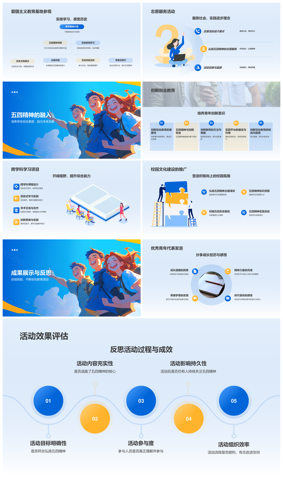 这是一张五四精神青年节学生爱国责任教育活动传承PPT模板,包含五四精神、青年节、学生、爱国、责任教育、活动、传承等主题内容,也可用作五四精神青年节爱国责任教育、五四精神青年节教育活动传承、青年节学生爱国责任传承、学生爱国责任教育活动、五四精神青年节责任教育、五四精神学生爱国教育活动、爱国责任教育活动传承、青年节学生爱国教育活动、五四精神爱国责任教育传承、五四精神教育活动传承、学生责任教育活动传承、青年节爱国责任教育、五四精神青年节学生、青年节责任教育传承、学生爱国教育活动等PPT场景使用。 风云办公提供的五四精神青年节学生爱国责任教育活动传承PPT模板,下载格式为pptx,一共17页,作品中文字及图均可以修改和编辑,图片更改请在作品中右键图片并更换,文字修改请直接点击文字进行修改。