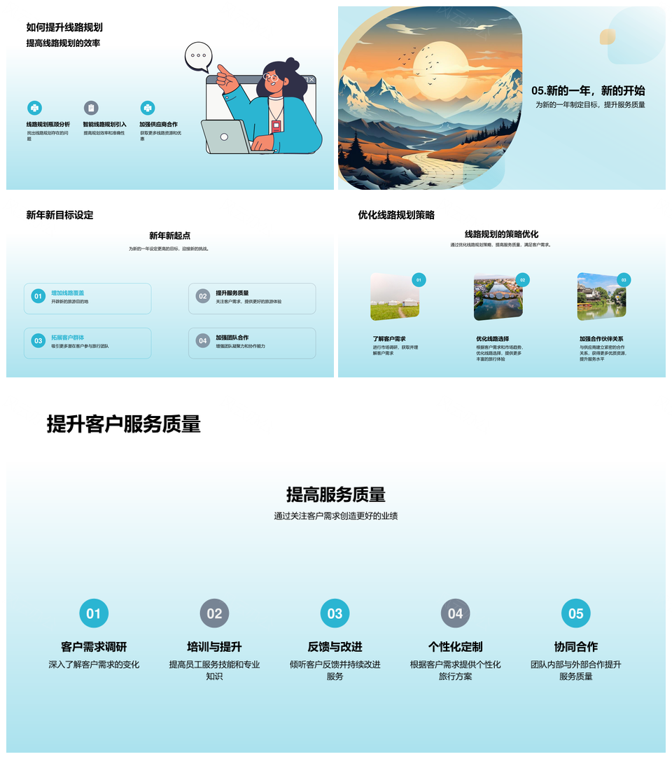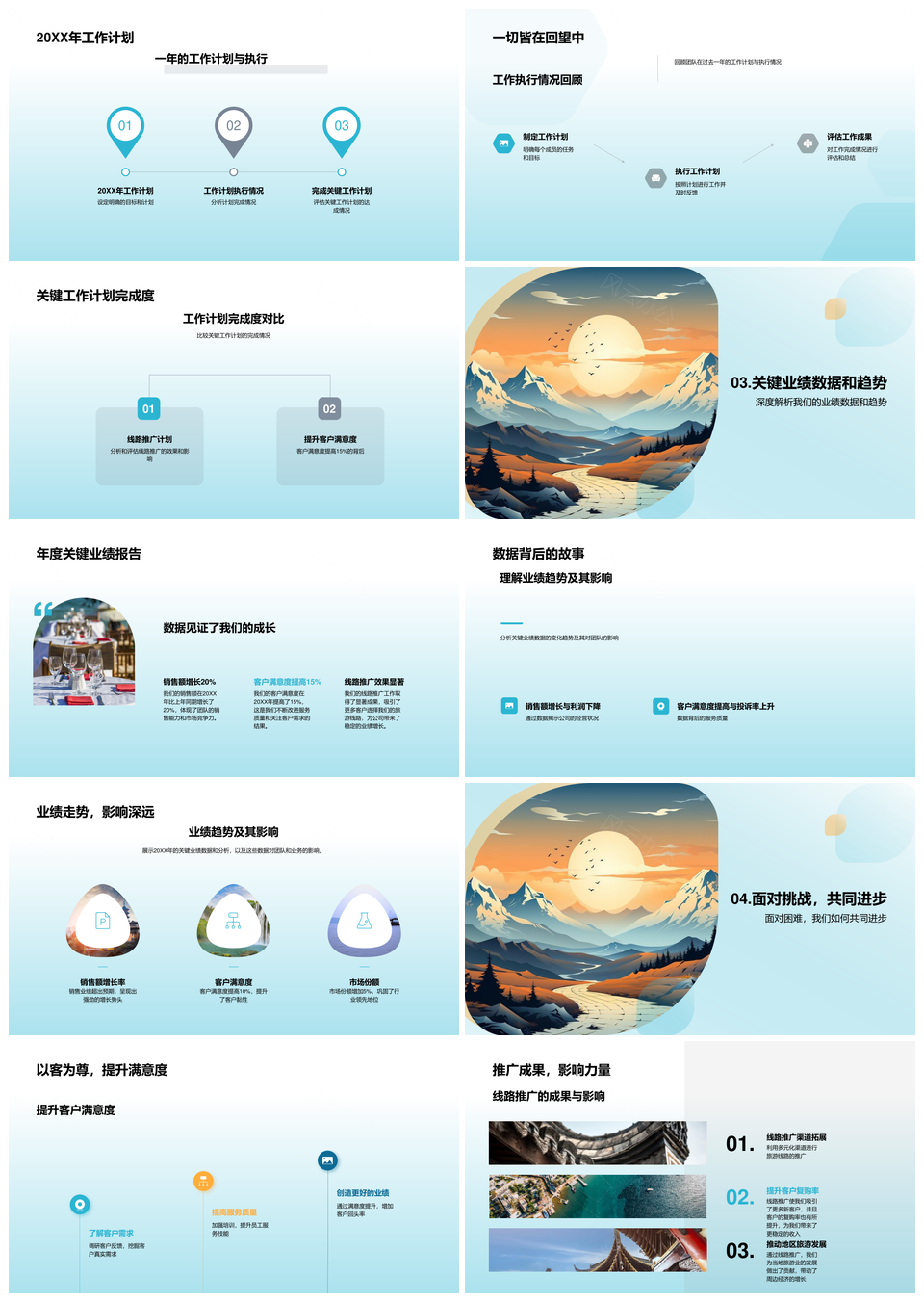 这是一张团队年度总结展望使命目标计划执行业绩趋势客户满意度山脉PPT模板,包含团队、年度、总结、展望、使命、目标、计划、执行、业绩、趋势、客户满意度、山脉等主题内容,也可用作团队年度总结展望、使命目标计划执行、计划执行业绩趋势、目标执行业绩趋势、年度总结展望使命、团队使命目标计划、团队年度目标计划、执行业绩趋势客户满意度、团队客户满意度山脉、客户满意度山脉、团队业绩趋势、使命执行业绩、目标趋势客户、总结展望使命目标、使命目标计划执行等PPT场景使用。 风云办公提供的团队年度总结展望使命目标计划执行业绩趋势客户满意度山脉PPT模板,下载格式为pptx,一共23页,作品中文字及图均可以修改和编辑,图片更改请在作品中右键图片并更换,文字修改请直接点击文字进行修改。