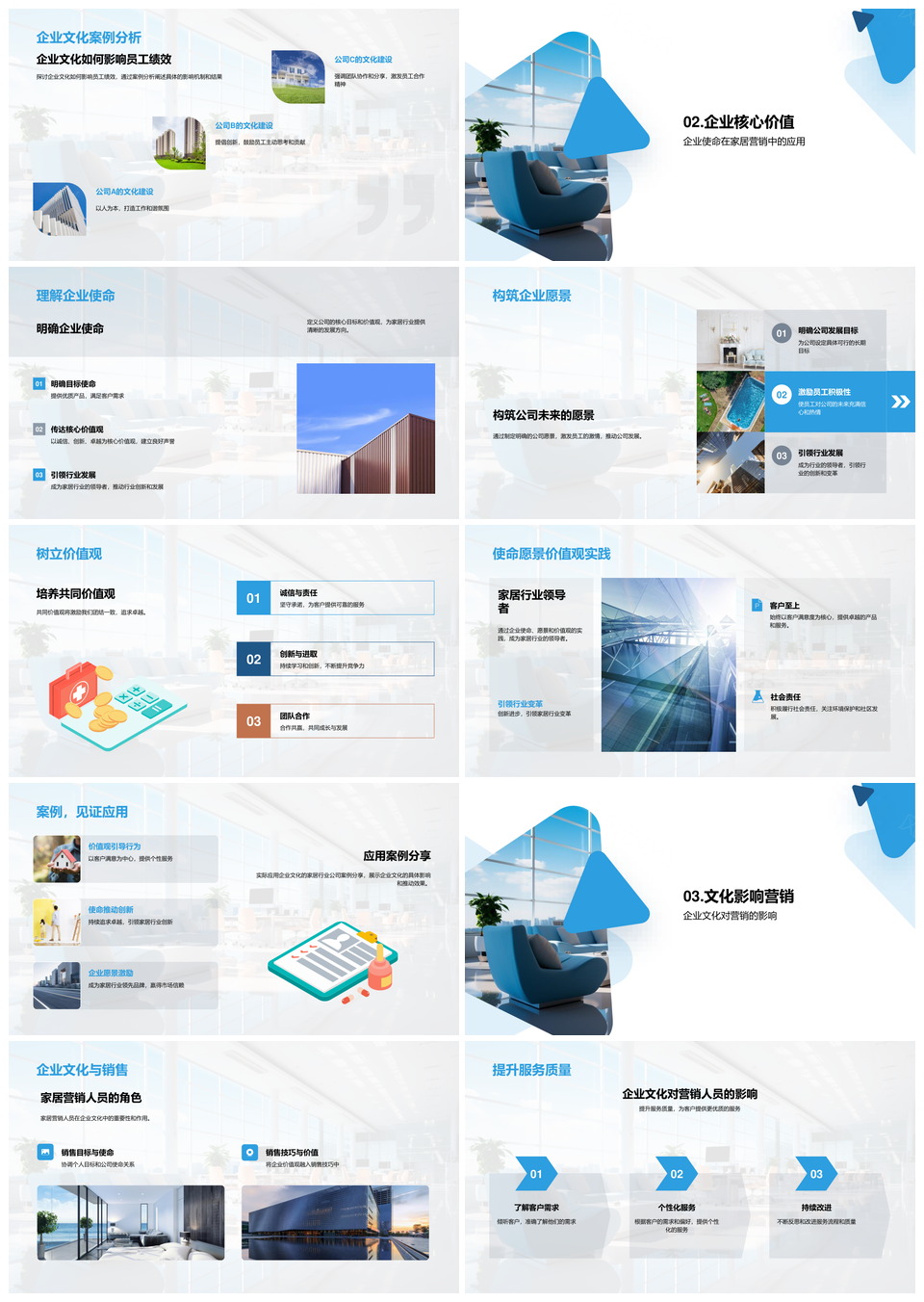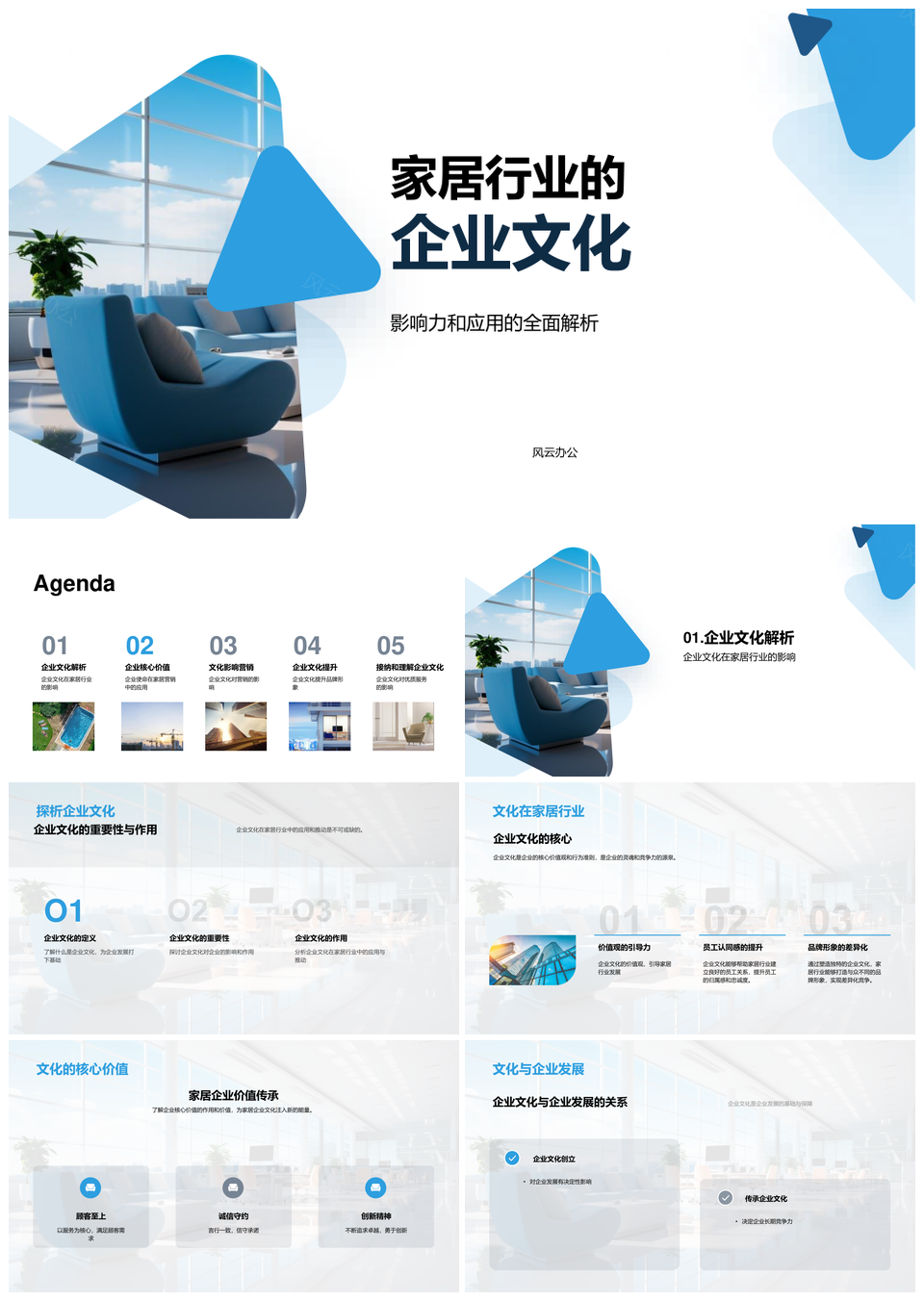 风云办公提供的家居企业文化引领品牌服务使命愿景PPT模板,下载格式为pptx,一共33页,作品中文字及图均可以修改和编辑,图片更改请在作品中右键图片并更换,文字修改请直接点击文字进行修改。