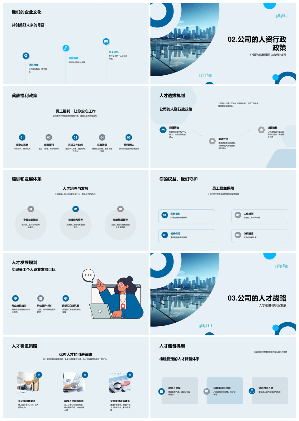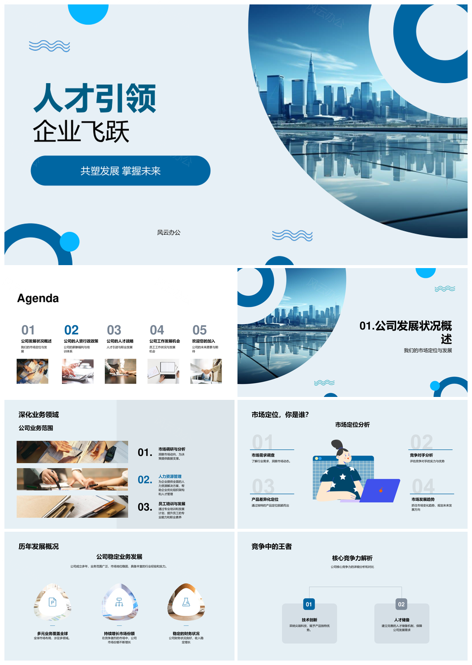 风云办公提供的人才战略引领企业多元飞跃发展PPT模板,下载格式为pptx,一共33页,作品中文字及图均可以修改和编辑,图片更改请在作品中右键图片并更换,文字修改请直接点击文字进行修改。