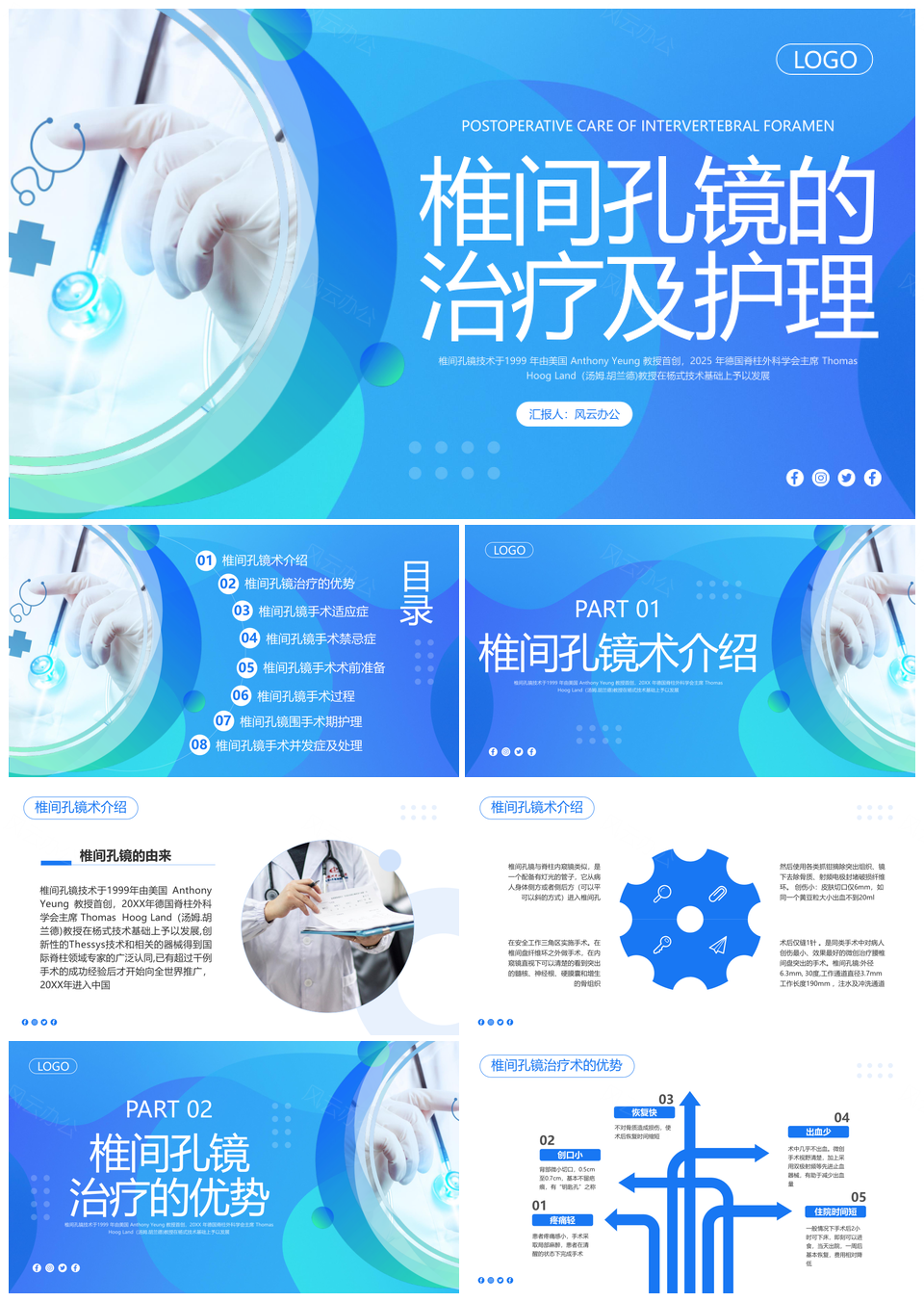 蓝色简约椎间孔镜术后护理培训PPT模板动态宣传推荐