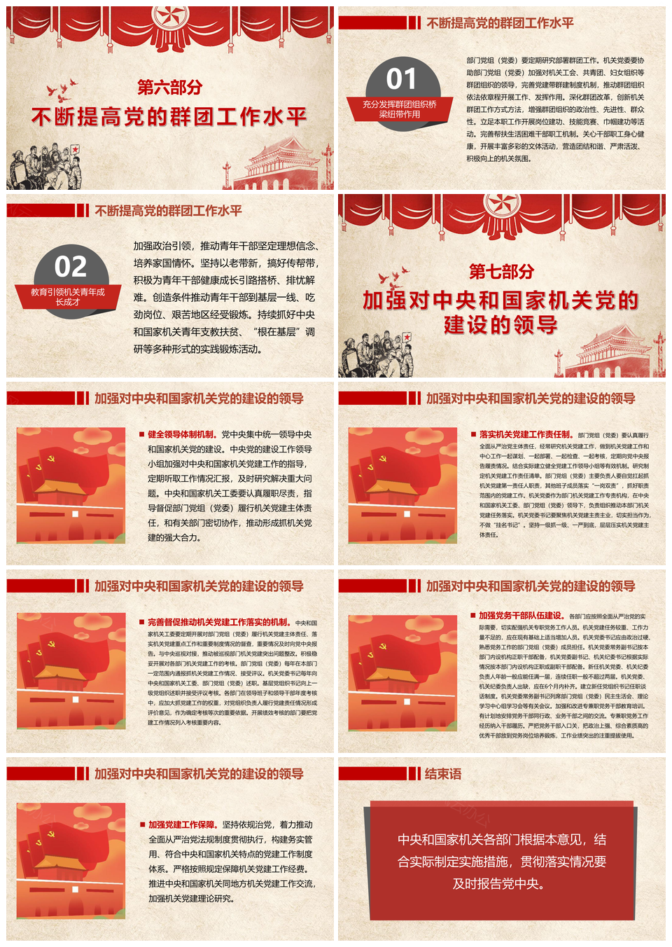 这是一张红色关于加强和改进中央和国家机关党的建设的意见PPT模板,包含红色、加强、改进、中央、国家机关、建设、意见等主题内容,也可用作红色关于加强改进、关于加强改进中央、加强改进中央国家机关、改进中央国家机关党的建设、中央国家机关党的建设意见、关于加强改进、加强改进中央、改进中央国家机关、中央国家机关党的建设、国家机关党的建设意见、红色关于、关于加强、加强改进、改进中央、中央国家机关、国家机关党的建设、党的建设意见等PPT场景使用。 风云办公提供的红色关于加强和改进中央和国家机关党的建设的意见PPT模板,下载格式为pptx,一共38页,作品中文字及图均可以修改和编辑,图片更改请在作品中右键图片并更换,文字修改请直接点击文字进行修改。