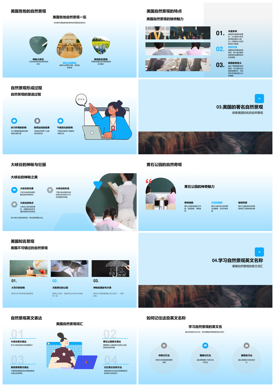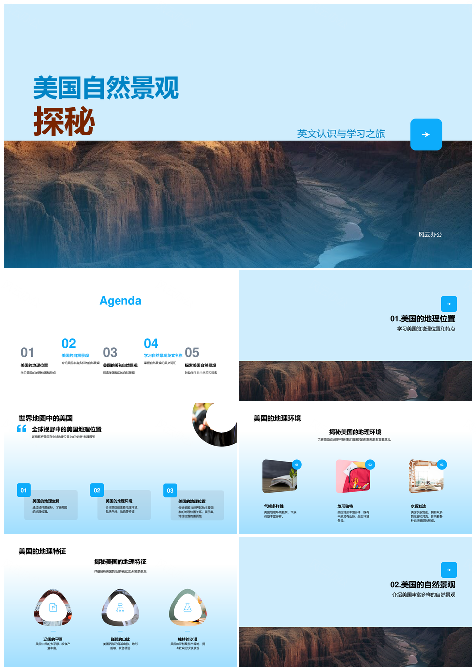 风云办公提供的美国大峡谷自然景观小学地理英语教学PPT模板,下载格式为pptx,一共23页,作品中文字及图均可以修改和编辑,图片更改请在作品中右键图片并更换,文字修改请直接点击文字进行修改。