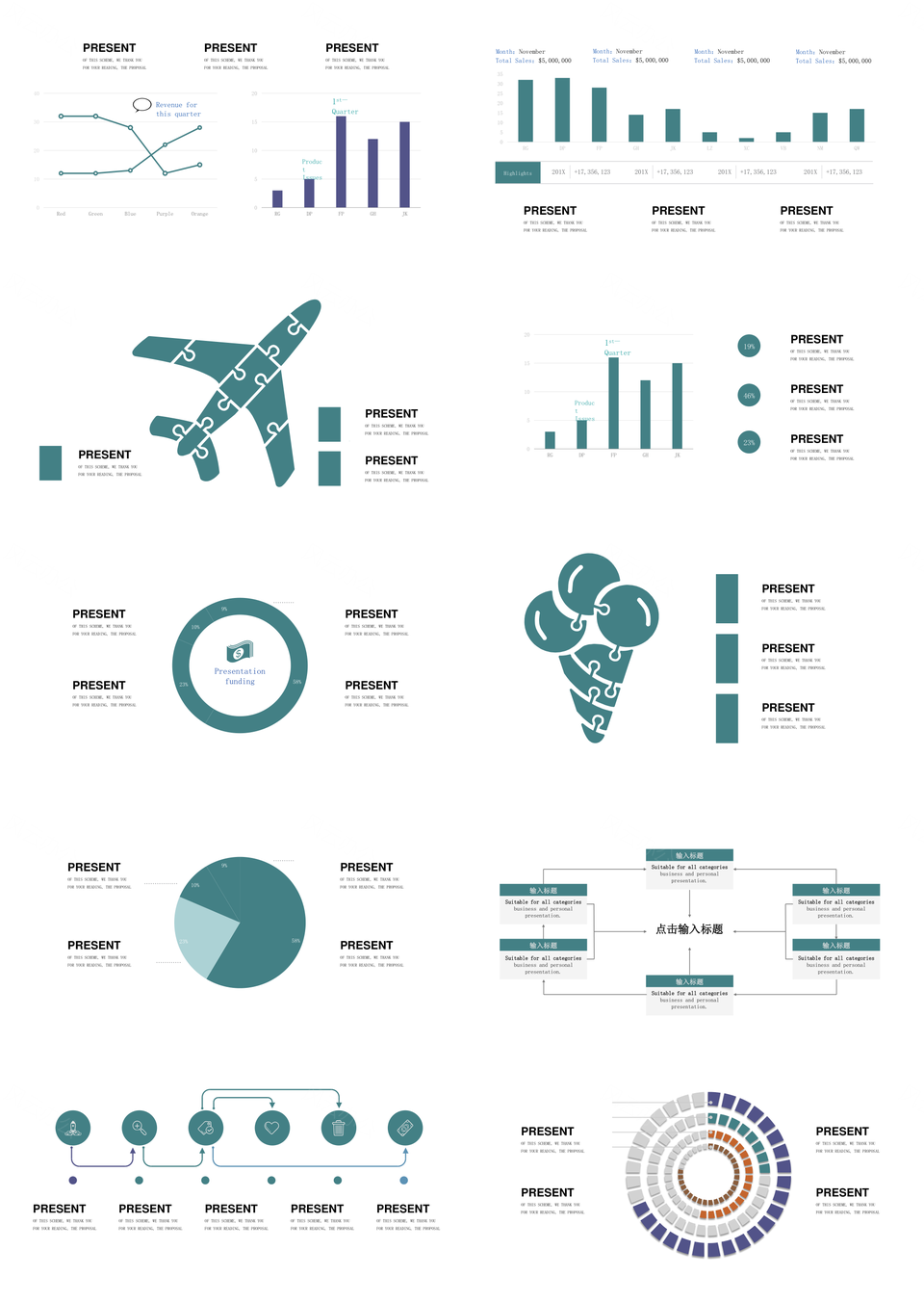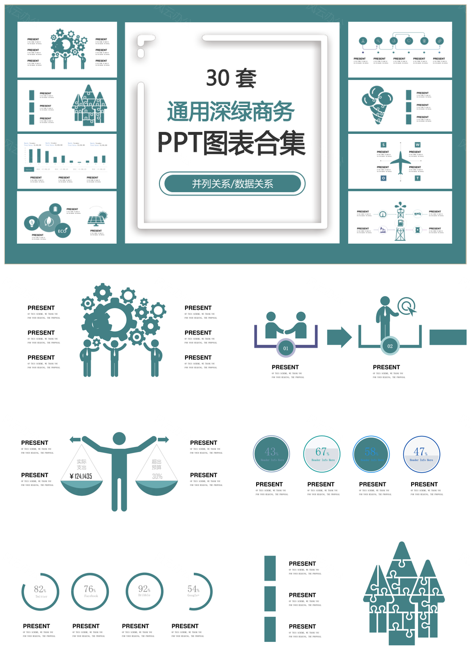 风云办公提供的通用深绿商务并列关系数据关系PPT图表合集,下载格式为pptx,一共31页,作品中文字及图均可以修改和编辑,图片更改请在作品中右键图片并更换,文字修改请直接点击文字进行修改。