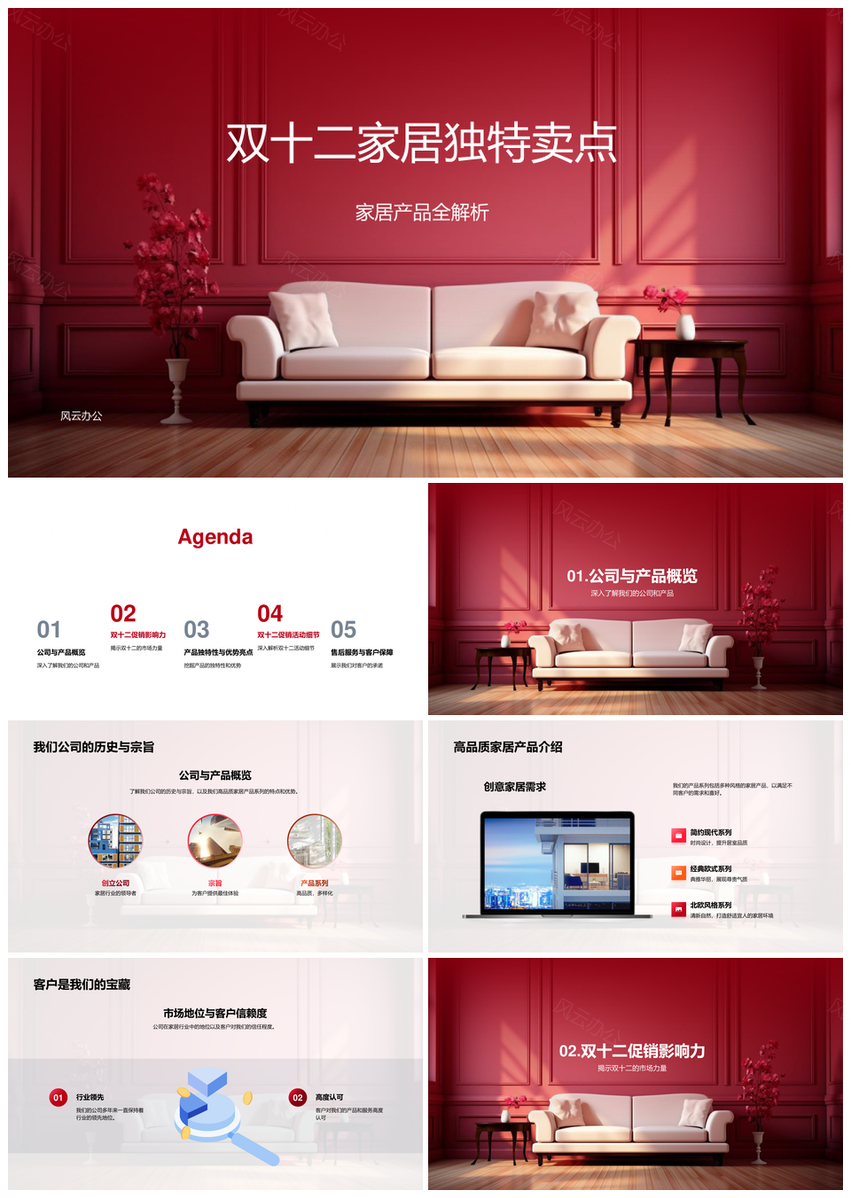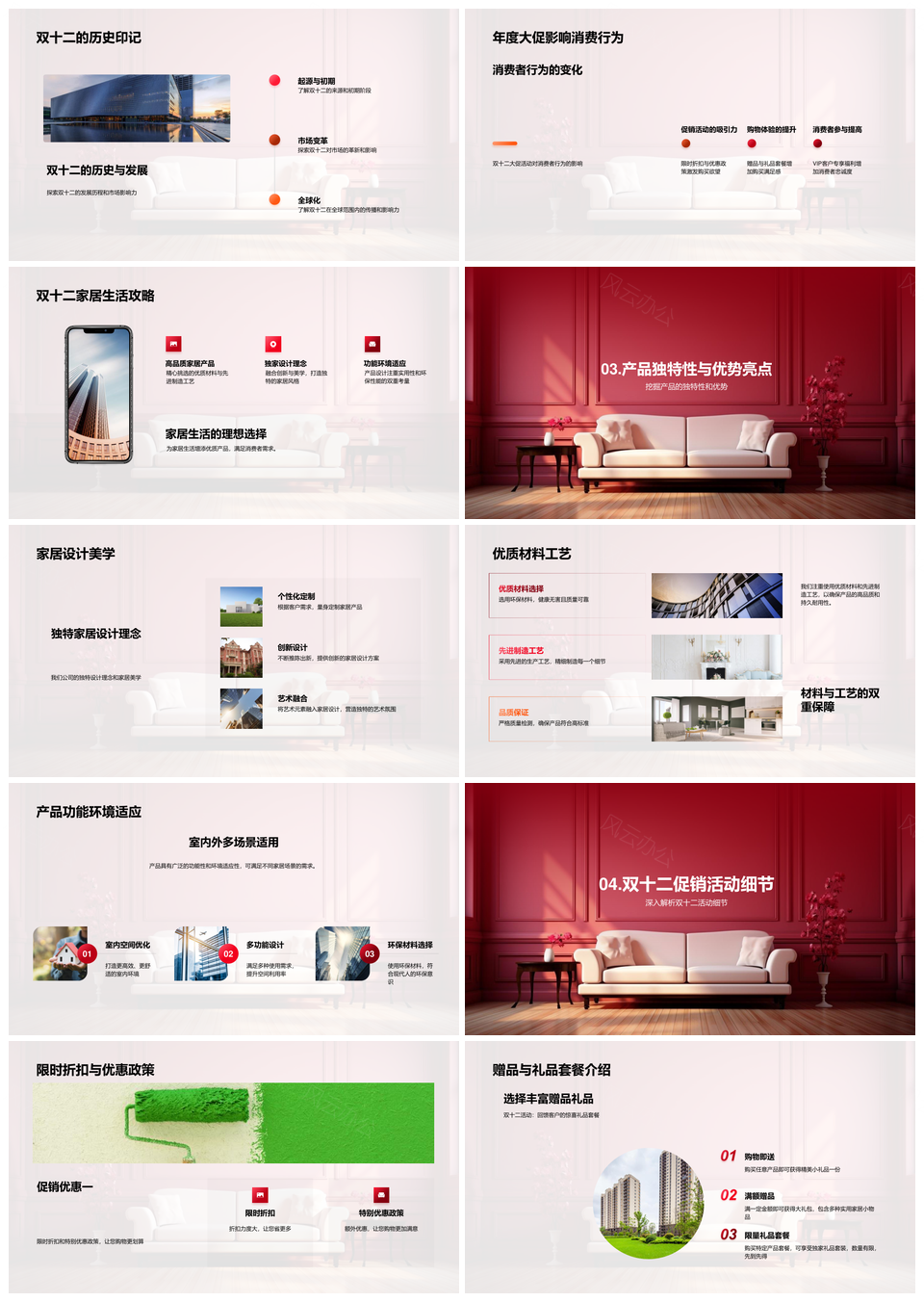 风云办公提供的双十二家居优材精工促销活动策划PPT模板,下载格式为pptx,一共23页,作品中文字及图均可以修改和编辑,图片更改请在作品中右键图片并更换,文字修改请直接点击文字进行修改。