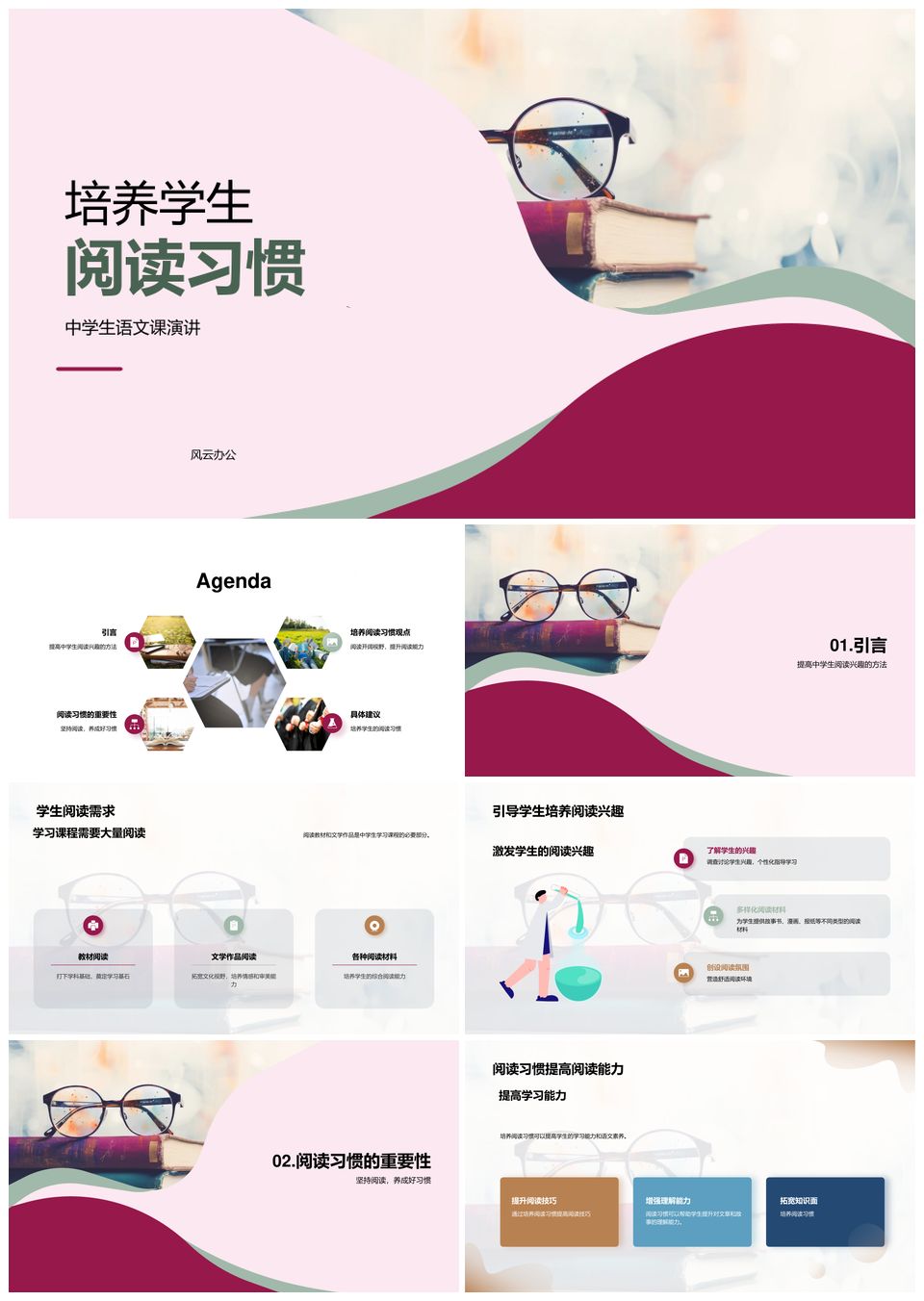 风云办公提供的中学生语文课演讲培养每日阅读习惯PPT模板,下载格式为pptx,一共18页,作品中文字及图均可以修改和编辑,图片更改请在作品中右键图片并更换,文字修改请直接点击文字进行修改。