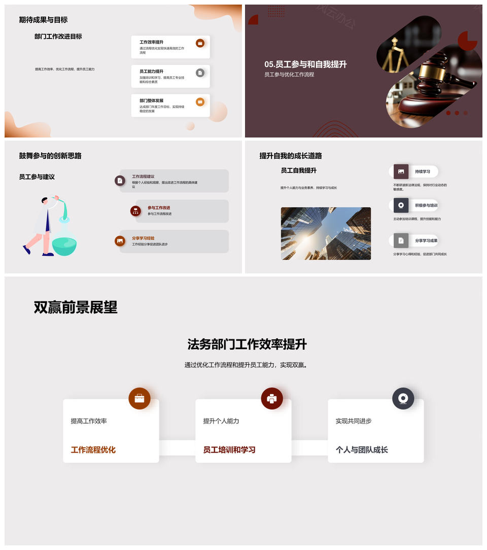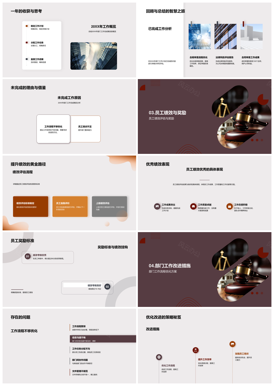 这是一张法务部绩效总结计划培训流程优化奖励目标PPT模板,包含法务部、绩效、总结、计划、培训、流程、优化、奖励、目标等主题内容,也可用作法务部绩效总结计划培训、绩效总结计划培训流程、总结计划培训流程优化、计划培训流程优化奖励、培训流程优化奖励目标、法务部绩效总结计划、绩效总结计划培训、总结计划培训流程、计划培训流程优化、培训流程优化奖励、流程优化奖励目标、法务部绩效总结、绩效总结计划、总结计划培训、计划培训流程、流程优化奖励、法务部绩效、绩效总结、总结计划、计划培训、培训流程、流程优化、优化奖励、奖励目标等PPT场景使用。 风云办公提供的法务部绩效总结计划培训流程优化奖励目标PPT模板,下载格式为pptx,一共23页,作品中文字及图均可以修改和编辑,图片更改请在作品中右键图片并更换,文字修改请直接点击文字进行修改。