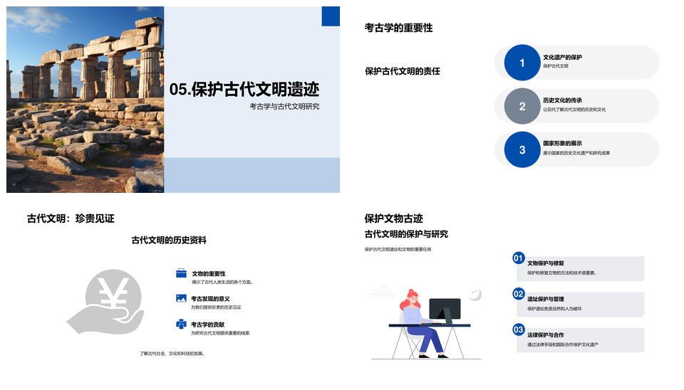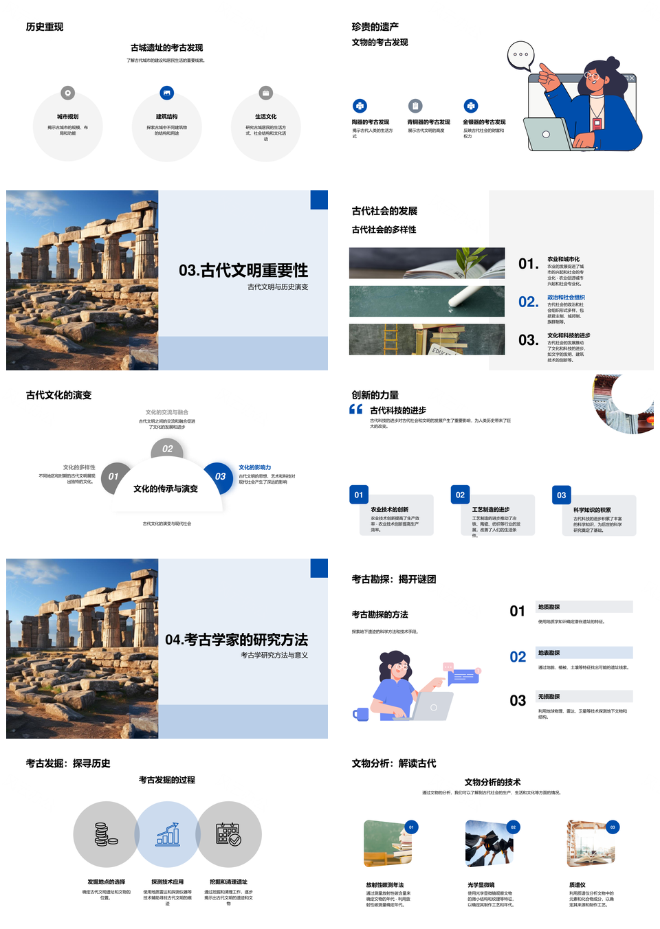 这是一张古墓古城遗址考古勘探揭秘古代社会文化科技PPT模板,包含古墓、古城、遗址、考古、勘探、揭秘、古代、社会、文化、科技等主题内容,也可用作古墓古城遗址考古、古城遗址考古勘探、遗址考古勘探揭秘、考古勘探揭秘古代、勘探揭秘古代社会、揭秘古代社会文化、古代社会文化科技、古墓古城遗址、古城遗址考古、遗址考古勘探、考古勘探揭秘、勘探揭秘古代、揭秘古代社会、古代社会文化、社会文化科技等PPT场景使用。 风云办公提供的古墓古城遗址考古勘探揭秘古代社会文化科技PPT模板,下载格式为pptx,一共22页,作品中文字及图均可以修改和编辑,图片更改请在作品中右键图片并更换,文字修改请直接点击文字进行修改。