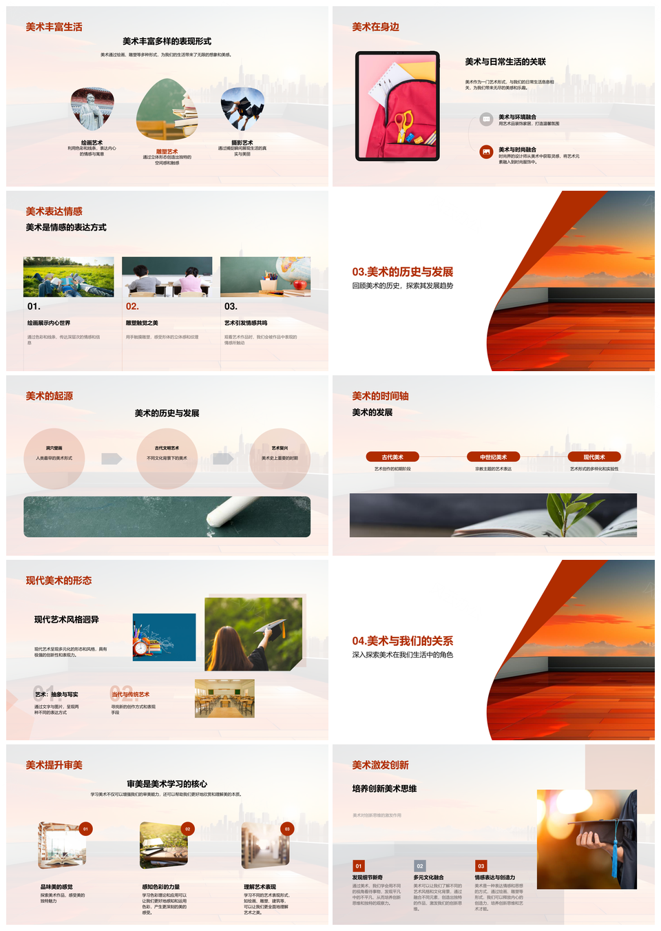 这是一张美术创新审美表达生活教育历史发展PPT模板,包含美术、创新、审美、表达、生活、教育、历史、发展等主题内容,也可用作美术创新审美表达、创新审美表达生活、审美表达生活教育、表达生活教育历史、生活教育历史发展、美术教育历史发展、美术创新生活教育、创新生活教育历史、教育历史发展、美术教育历史、创新表达生活、生活历史发展、教育发展、历史发展、美术教育等PPT场景使用。