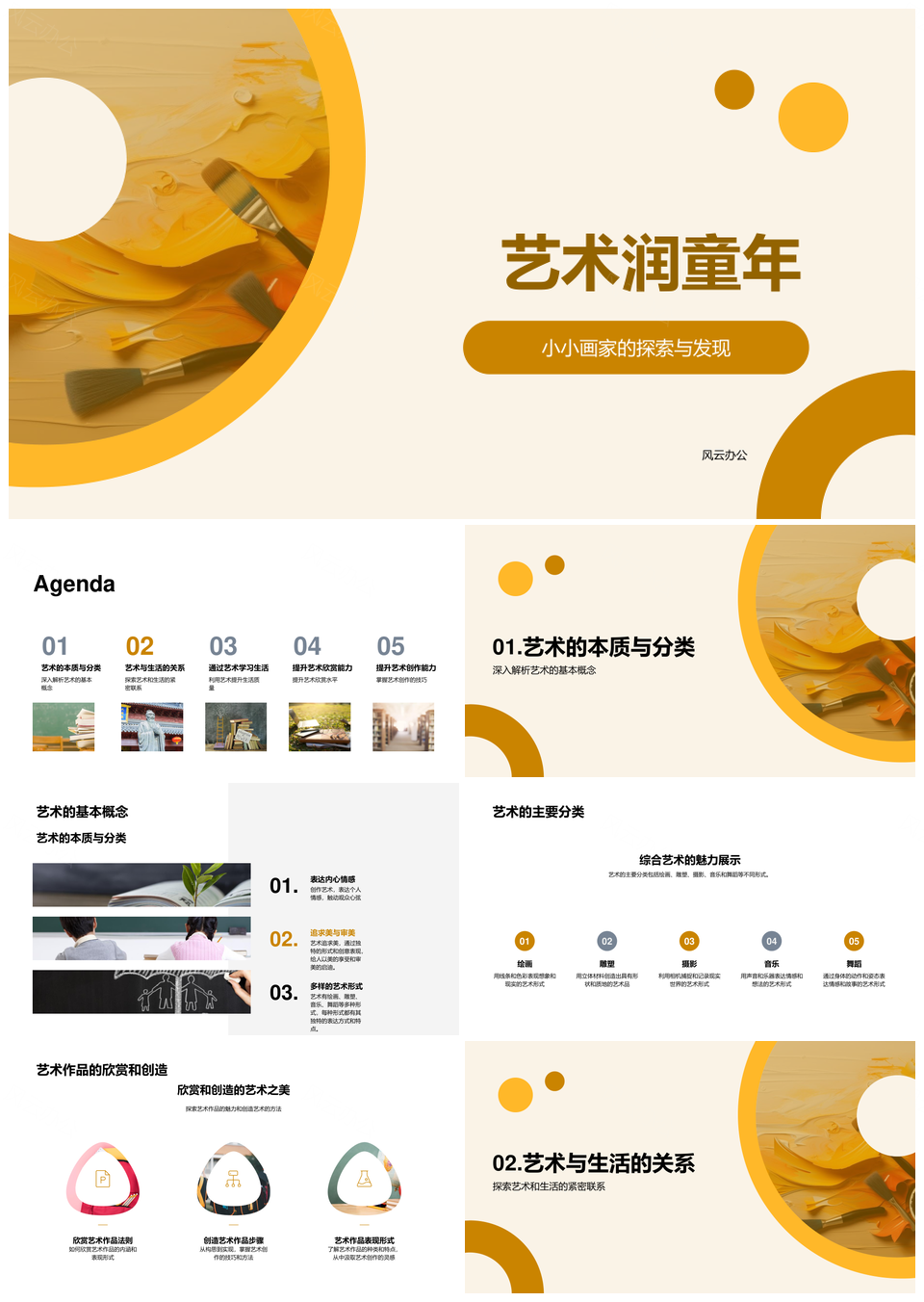 风云办公提供的艺术润童年画笔美育提升生活PPT模板,下载格式为pptx,一共23页,作品中文字及图均可以修改和编辑,图片更改请在作品中右键图片并更换,文字修改请直接点击文字进行修改。