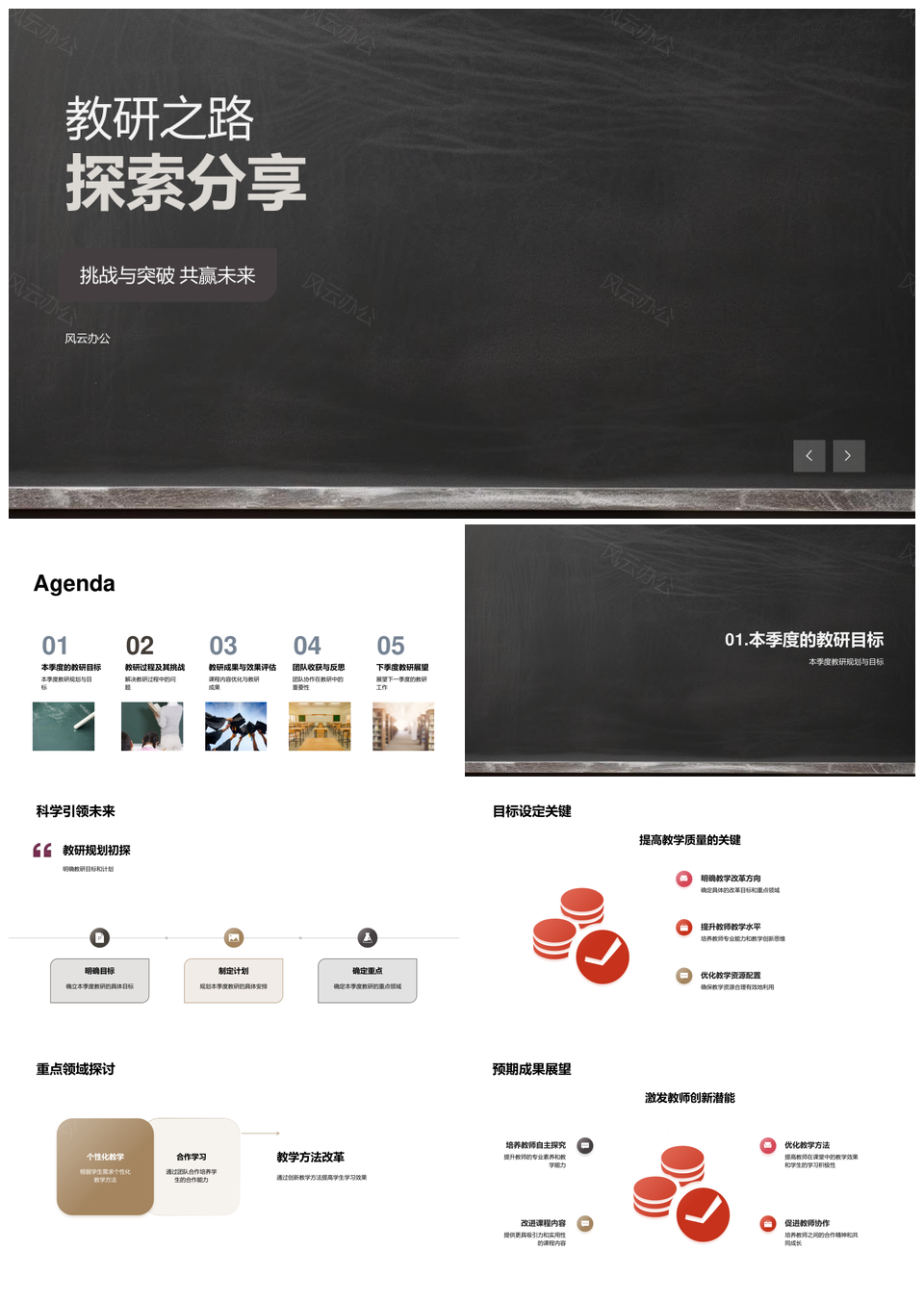 风云办公提供的教研团队协作改革课程优化季度总结PPT模板,下载格式为pptx,一共28页,作品中文字及图均可以修改和编辑,图片更改请在作品中右键图片并更换,文字修改请直接点击文字进行修改。