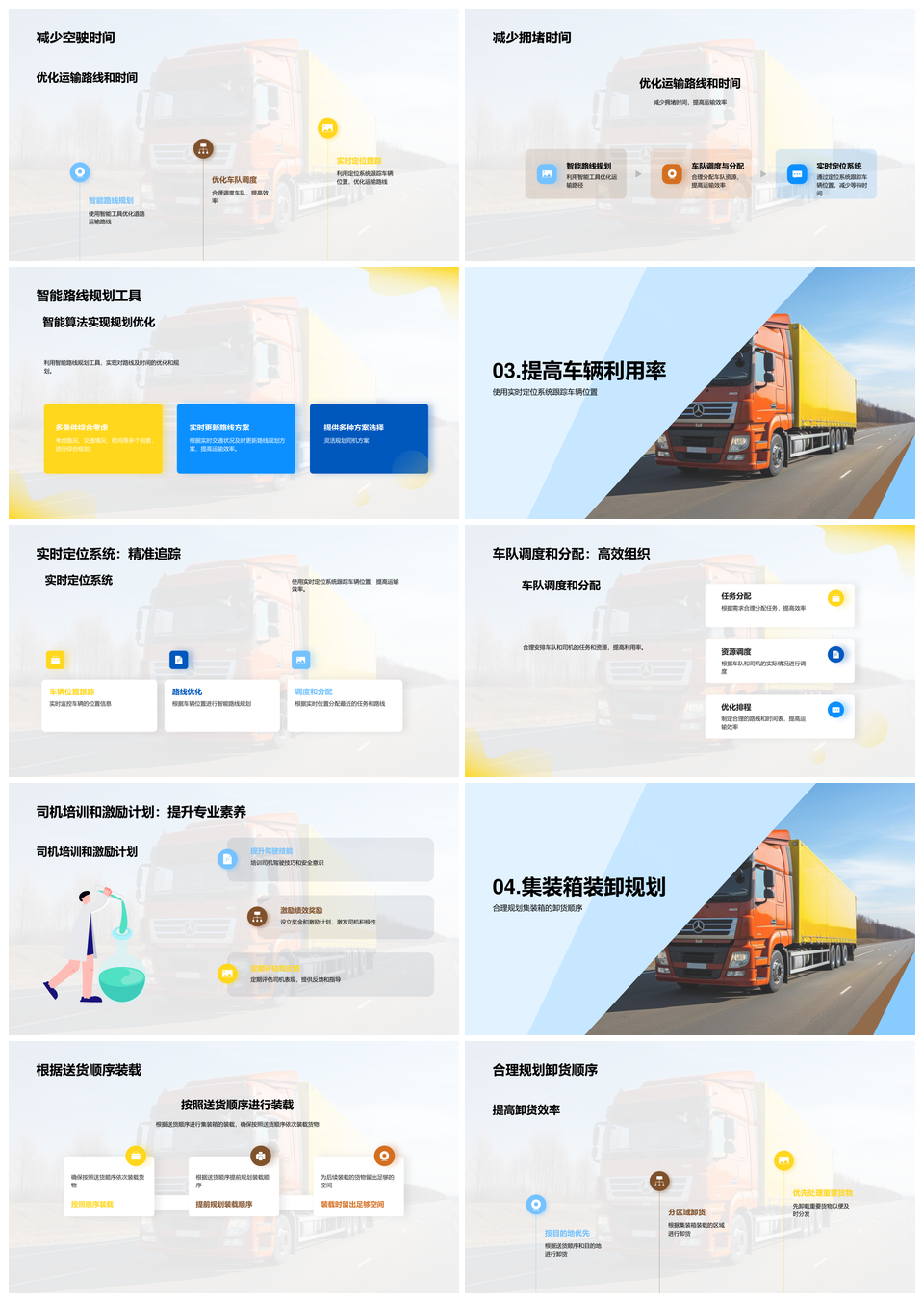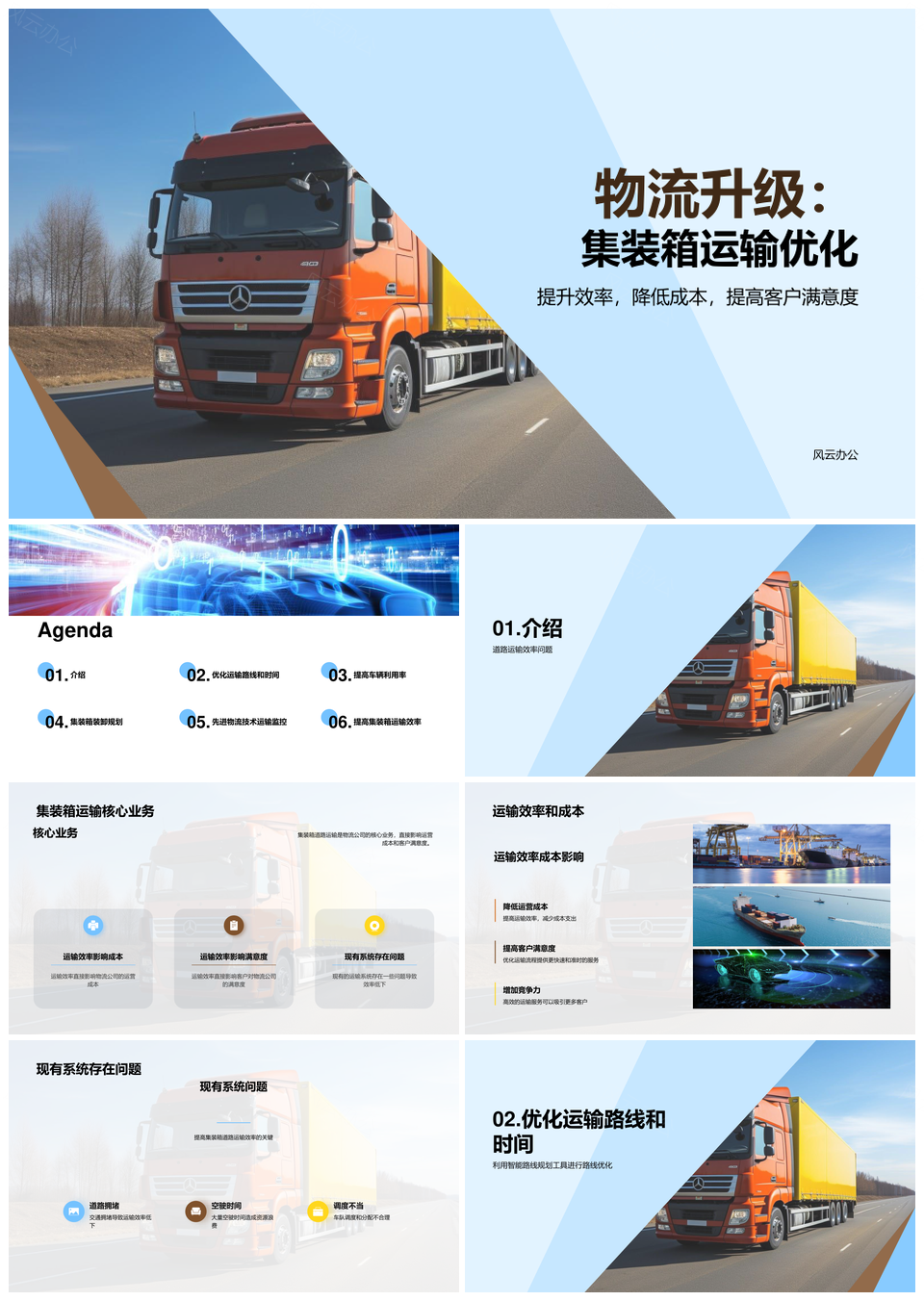 这是一张物流智能路线优化集装箱运输效率降成本PPT模板,包含物流、智能、路线、优化、集装箱、运输、效率、降成本等主题内容,也可用作物流智能路线优化集装箱运输、智能路线优化集装箱运输效率、路线优化集装箱运输效率降成本、物流智能路线优化降成本、智能路线优化集装箱运输、集装箱运输效率降成本、物流智能集装箱运输、智能集装箱运输效率、路线优化效率降成本、物流路线优化降成本、智能路线优化效率、物流智能降成本、路线优化集装箱运输、物流集装箱运输、效率降成本等PPT场景使用。 风云办公提供的物流智能路线优化集装箱运输效率降成本PPT模板,下载格式为pptx,一共27页,作品中文字及图均可以修改和编辑,图片更改请在作品中右键图片并更换,文字修改请直接点击文字进行修改。