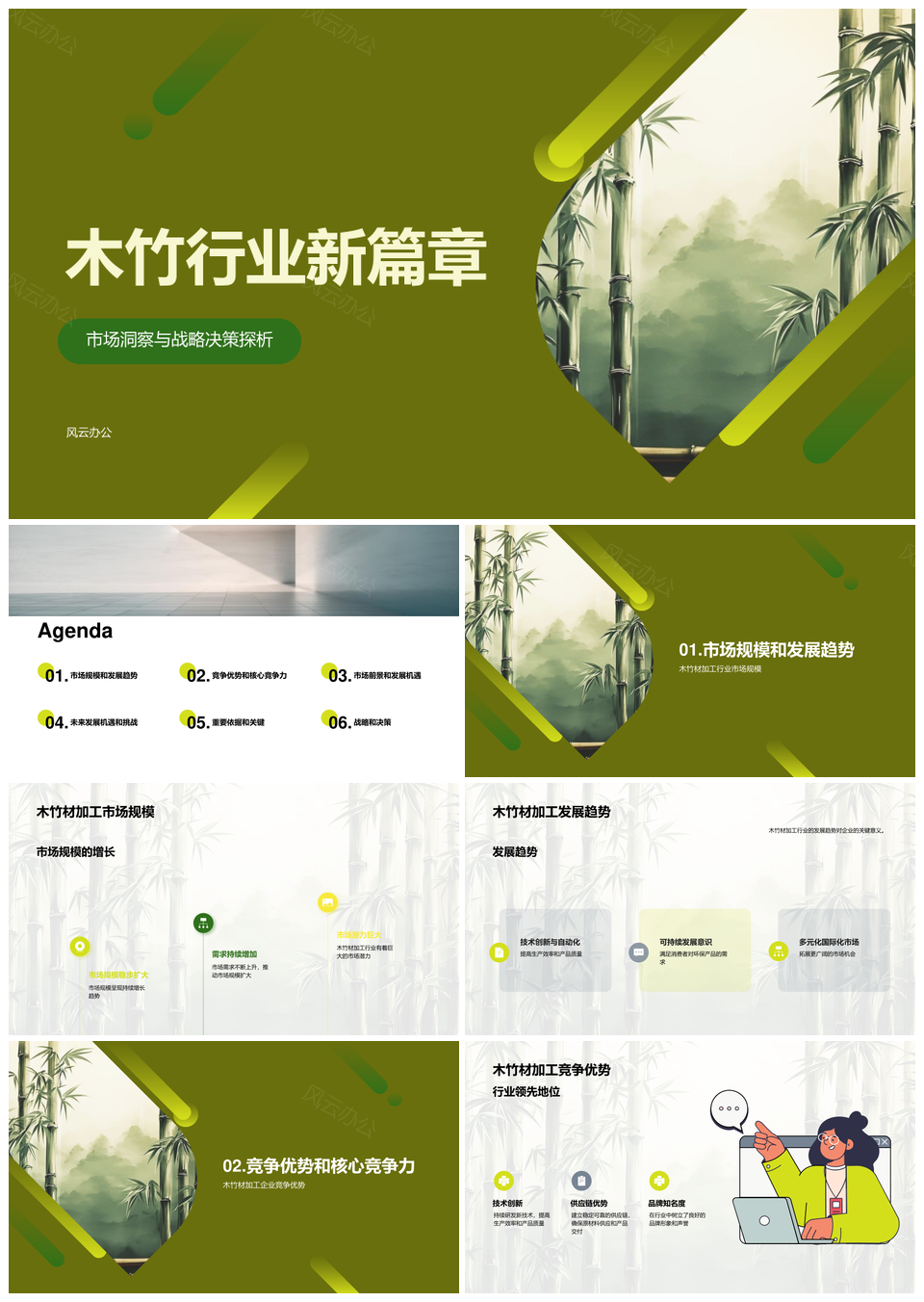 风云办公提供的绿色木竹创新引领市场新绿洲发展PPT模板,下载格式为pptx,一共22页,作品中文字及图均可以修改和编辑,图片更改请在作品中右键图片并更换,文字修改请直接点击文字进行修改。