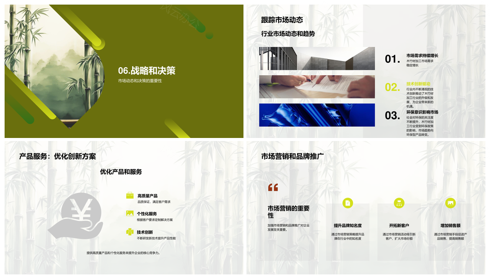 这是一张绿色木竹创新引领市场新绿洲发展PPT模板,包含绿色、木竹、创新、引领、市场、新绿洲、发展等主题内容,也可用作绿色木竹创新引领、木竹创新引领市场、创新引领市场新绿洲、引领市场新绿洲发展、绿色创新引领市场、绿色木竹创新引领市场、木竹创新市场新绿洲、创新市场新绿洲发展、绿色木竹创新、木竹创新引领、创新引领市场、引领市场新绿洲、市场新绿洲发展、绿色创新引领、创新引领发展等PPT场景使用。