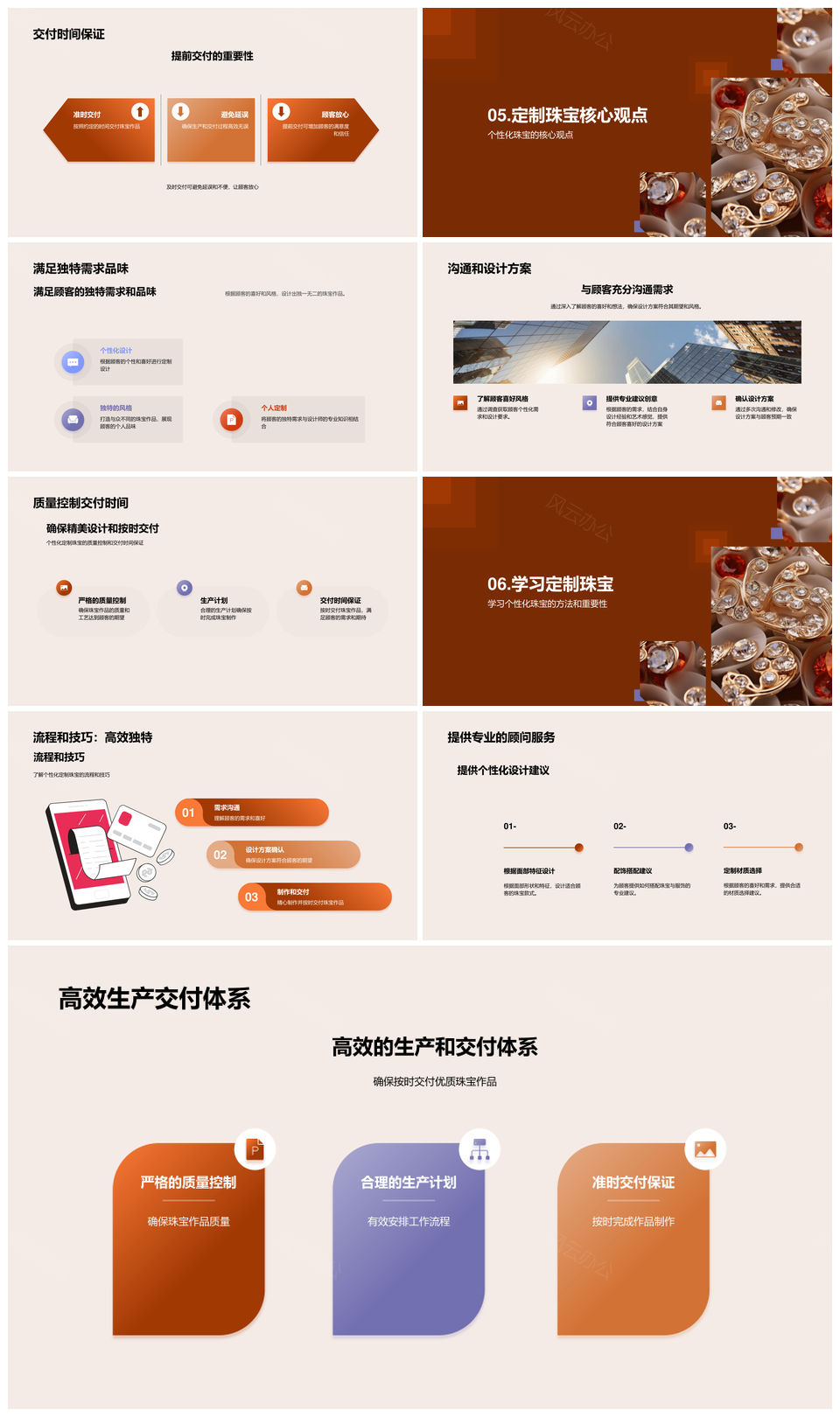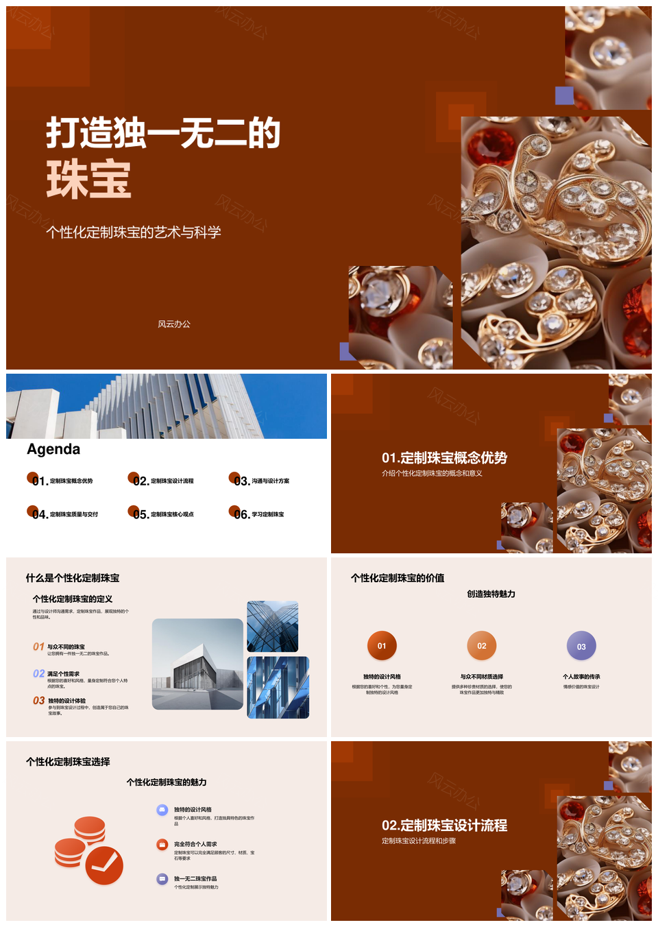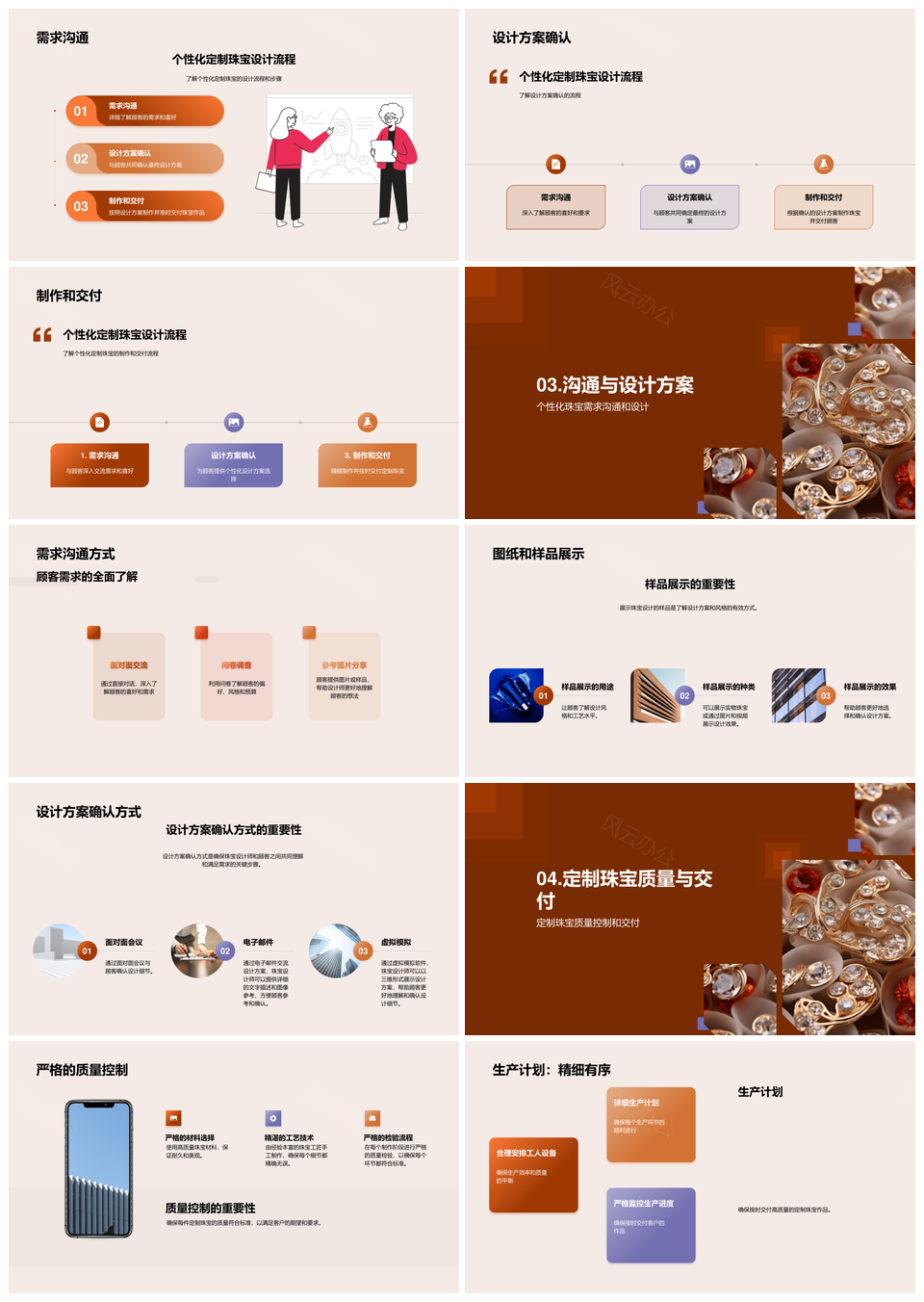 风云办公提供的个性化珠宝定制设计制作交付全流程PPT模板,下载格式为pptx,一共27页,作品中文字及图均可以修改和编辑,图片更改请在作品中右键图片并更换,文字修改请直接点击文字进行修改。