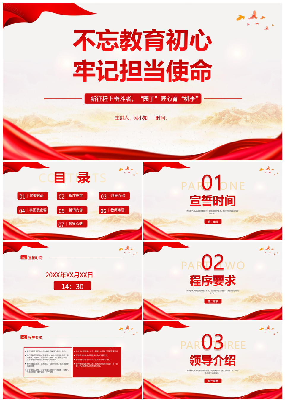 这是一张2025中国风党建教育初心教师宣誓培训PPT模板,包含2025、中国风、党建、教育、初心、教师、宣誓、培训等主题内容,也可用作2025中国风党建教育初心、中国风党建教育初心教师、党建教育初心教师宣誓、教育初心教师宣誓培训、2025中国风党建教育、中国风党建教育初心、党建教育初心教师、教育初心教师宣誓、初心教师宣誓培训、2025中国风党建、中国风党建教育、党建教育初心、教育初心教师、初心教师宣誓、教师宣誓培训等PPT场景使用。 风云办公提供的2025中国风党建教育初心教师宣誓培训PPT模板,下载格式为pptx,一共18页,作品中文字及图均可以修改和编辑,图片更改请在作品中右键图片并更换,文字修改请直接点击文字进行修改。