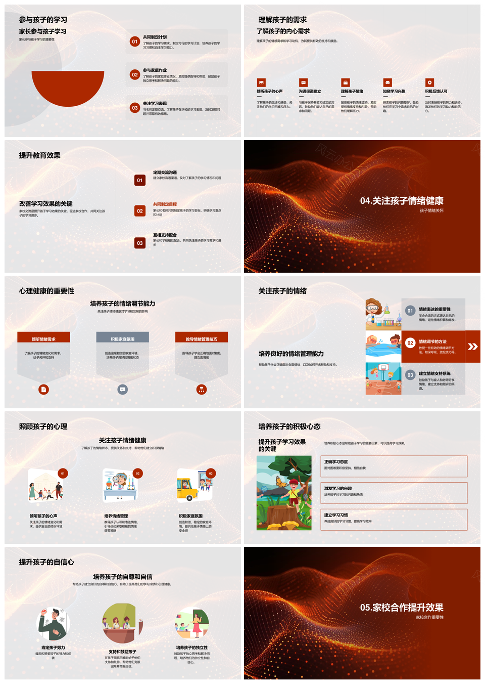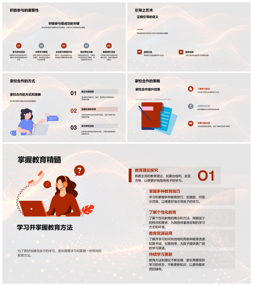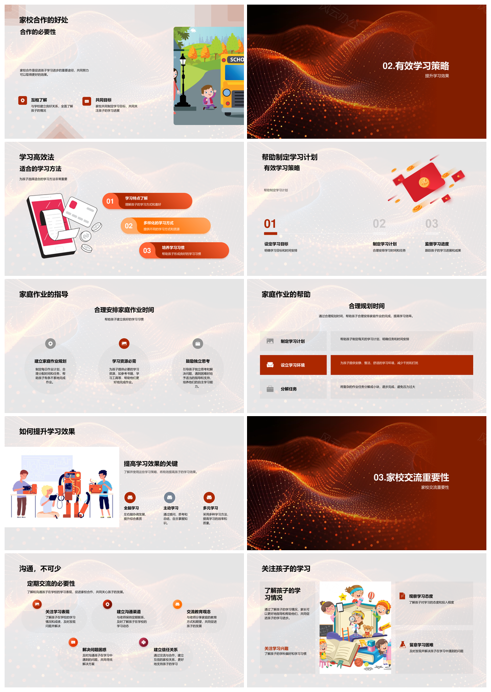 这是一张家校合作学习策略家庭教育计划指导交流表现PPT模板,包含家校合作、学习策略、家庭教育、计划、指导、交流、表现等主题内容,也可用作家校合作学习策略家庭教育、家校合作学习策略教育计划、家校合作学习策略计划指导、家校合作家庭教育计划指导、学习策略家庭教育计划指导、家庭教育计划指导交流表现、家校合作学习策略教育、家校合作家庭教育计划、学习策略家庭教育计划、家庭教育计划指导交流、家校合作学习策略、家庭教育计划指导、计划指导交流表现、家校合作家庭教育、家庭教育计划指导等PPT场景使用。 风云办公提供的家校合作学习策略家庭教育计划指导交流表现PPT模板,下载格式为pptx,一共33页,作品中文字及图均可以修改和编辑,图片更改请在作品中右键图片并更换,文字修改请直接点击文字进行修改。