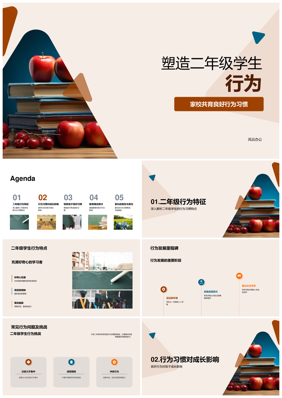 风云办公提供的二年级学生行为塑造与校园社交引导PPT模板,下载格式为pptx,一共23页,作品中文字及图均可以修改和编辑,图片更改请在作品中右键图片并更换,文字修改请直接点击文字进行修改。