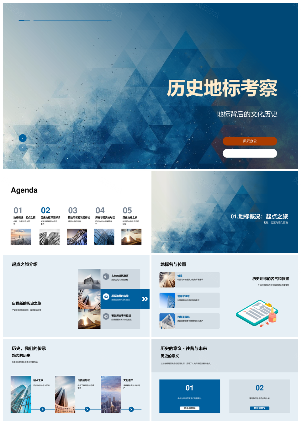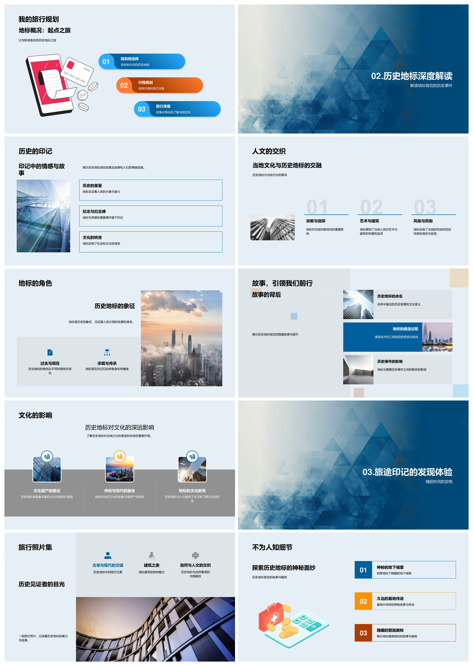 风云办公提供的历史文化地标旅行规划相册PPT模板,下载格式为pptx,一共33页,作品中文字及图均可以修改和编辑,图片更改请在作品中右键图片并更换,文字修改请直接点击文字进行修改。