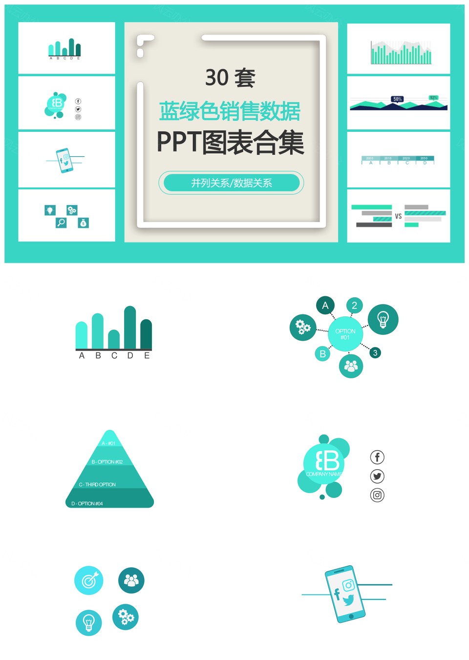 这是一张蓝绿色销售数据并列关系数据关系PPT图表合集,包含蓝绿色、销售数据、并列关系、数据关系、图表合集等主题内容,也可用作蓝绿色、销售数据、并列关系、数据关系、PPT图表、合集