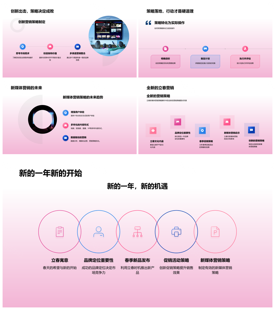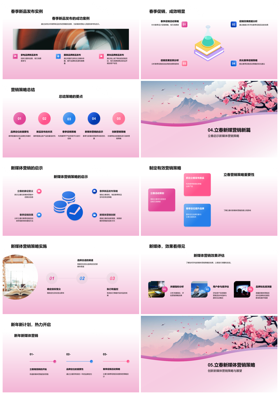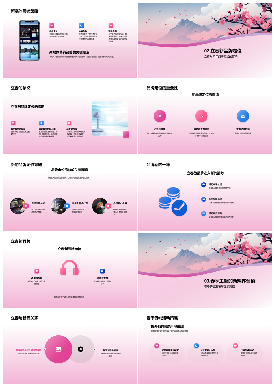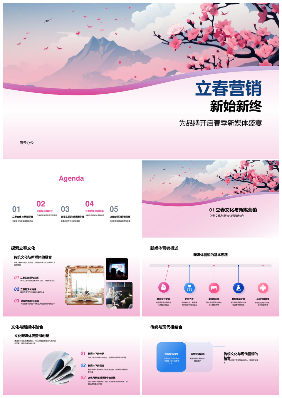 风云办公提供的立春新媒体营销策略品牌新品樱花盛宴PPT模板,下载格式为pptx,一共33页,作品中文字及图均可以修改和编辑,图片更改请在作品中右键图片并更换,文字修改请直接点击文字进行修改。