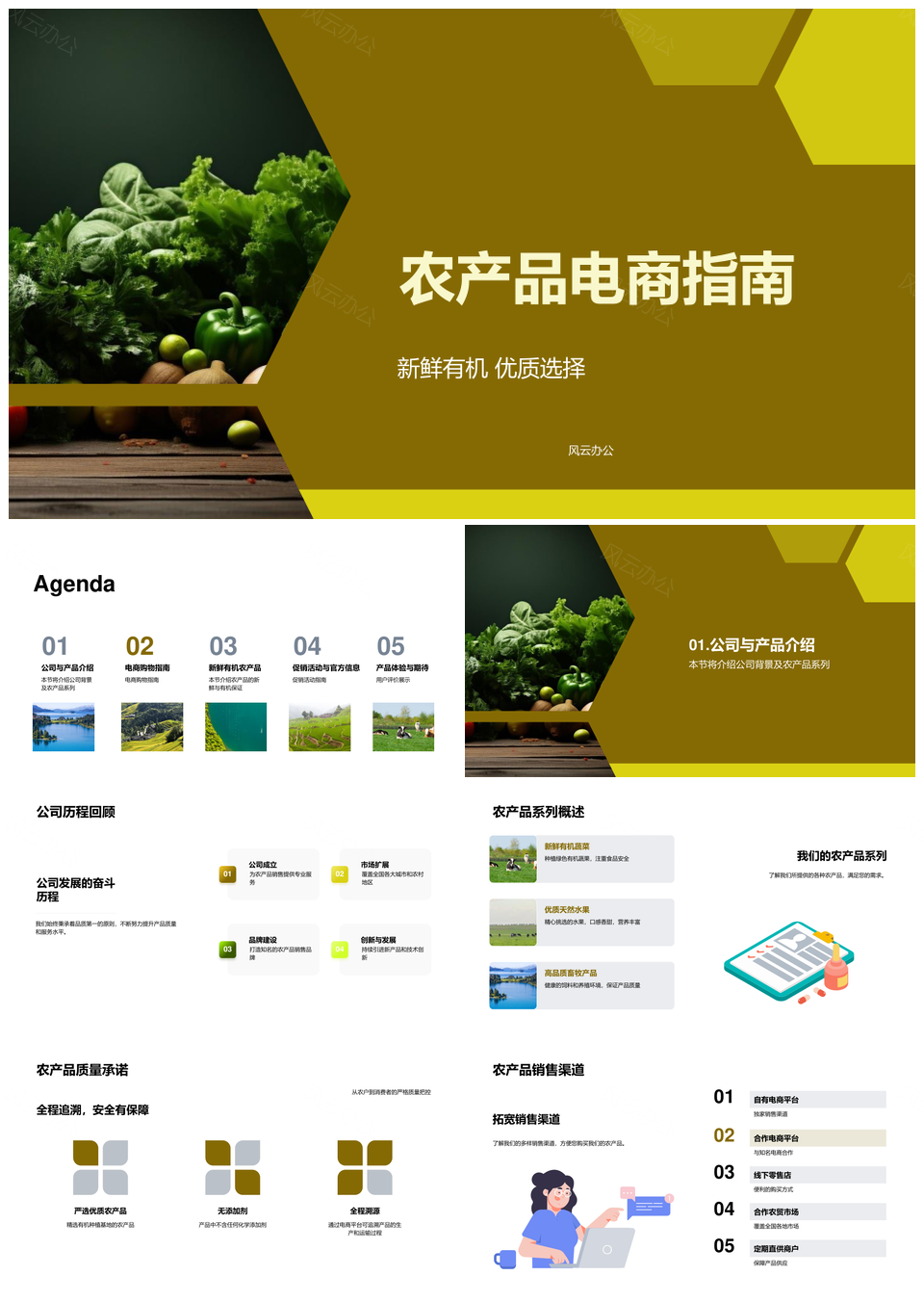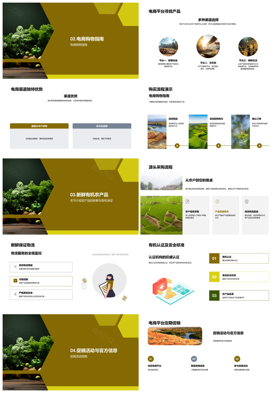 风云办公提供的农产品电商新鲜有机蔬菜优质选择指南PPT模板,下载格式为pptx,一共24页,作品中文字及图均可以修改和编辑,图片更改请在作品中右键图片并更换,文字修改请直接点击文字进行修改。