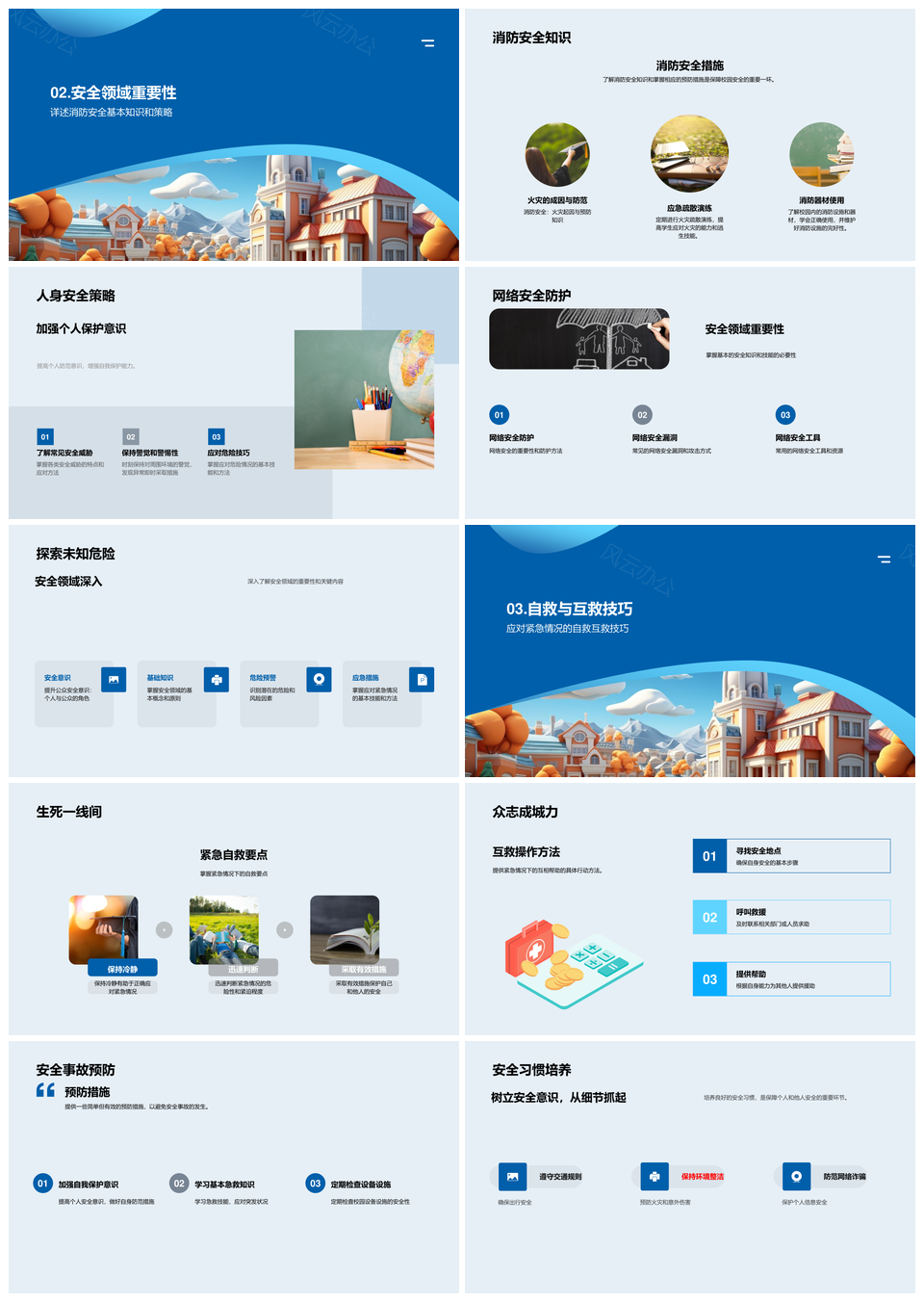 风云办公提供的校园安全构建消防人身网络意识教育PPT模板,下载格式为pptx,一共28页,作品中文字及图均可以修改和编辑,图片更改请在作品中右键图片并更换,文字修改请直接点击文字进行修改。