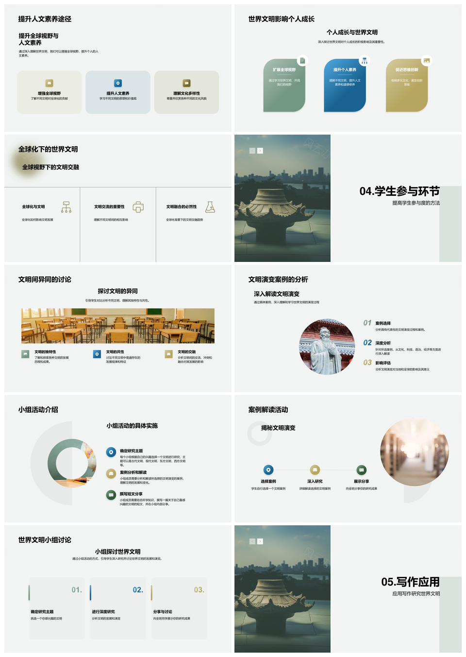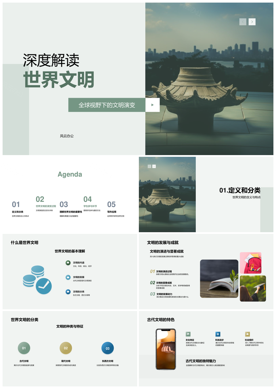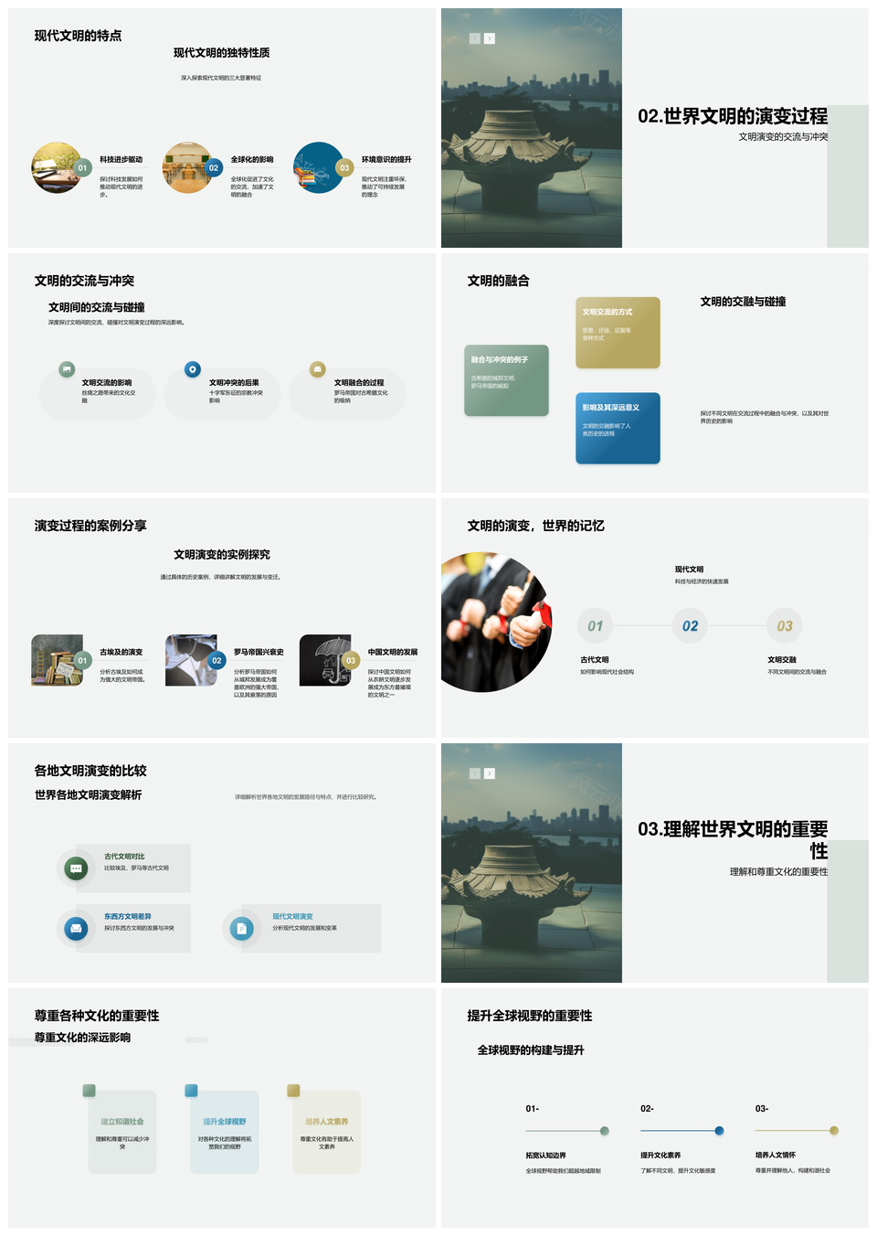 风云办公提供的全球视野下世界文明古今交融演变PPT模板,下载格式为pptx,一共33页,作品中文字及图均可以修改和编辑,图片更改请在作品中右键图片并更换,文字修改请直接点击文字进行修改。