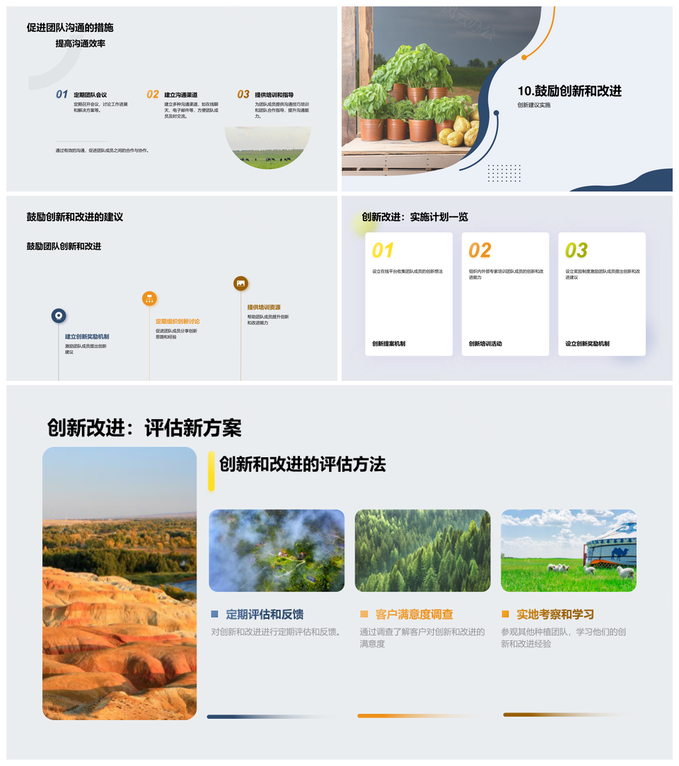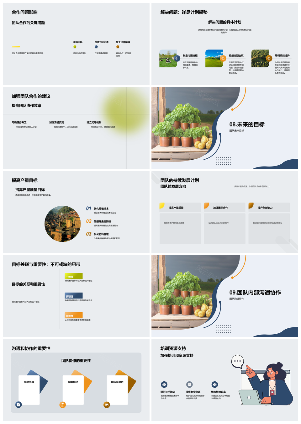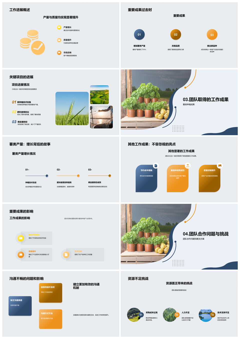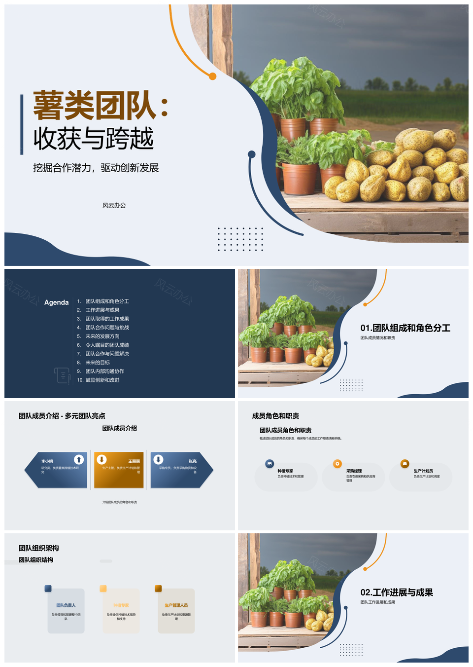这是一张薯类种植团队总结负责人成员职责成果进展PPT模板,包含薯类种植、团队、总结、负责人、成员、职责、成果、进展等主题内容,也可用作薯类种植团队总结、种植团队总结负责人、团队总结负责人成员、总结负责人成员职责、负责人成员职责成果、成员职责成果进展、薯类种植团队、种植团队总结、团队总结负责人、总结负责人成员、负责人成员职责、成员职责成果、薯类种植、种植团队、团队总结等PPT场景使用。 风云办公提供的薯类种植团队总结负责人成员职责成果进展PPT模板,下载格式为pptx,一共43页,作品中文字及图均可以修改和编辑,图片更改请在作品中右键图片并更换,文字修改请直接点击文字进行修改。