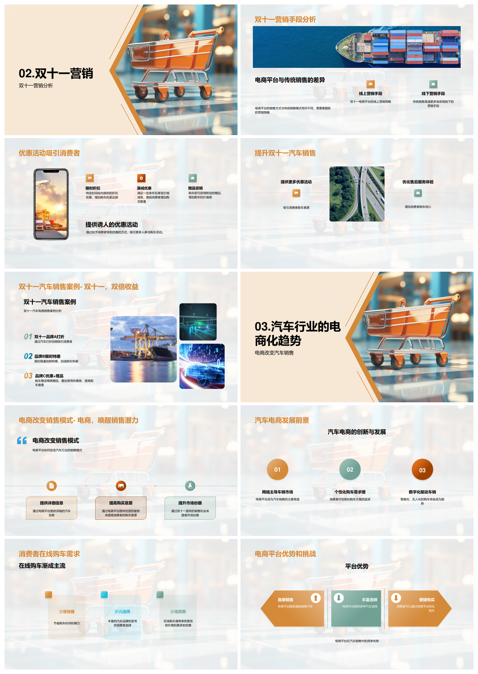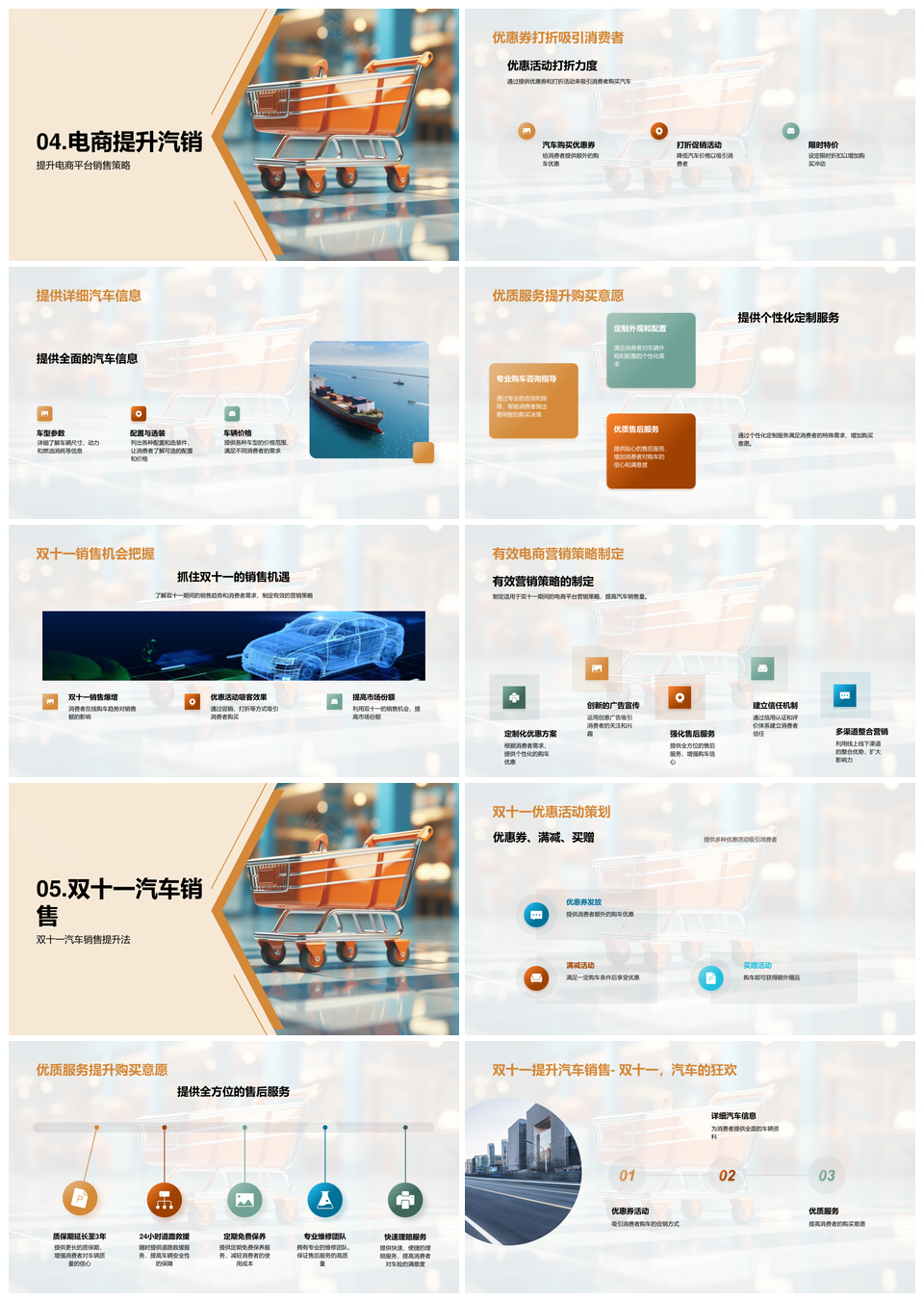 这是一张汽车电商双十一营销优惠促电动汽车销售PPT模板,包含汽车、电商、双十一、营销、优惠、促、电动汽车、销售等主题内容,也可用作汽车电商双十一营销、电商双十一营销优惠、双十一营销优惠电动汽车、营销优惠电动汽车销售、汽车电商双十一、电商双十一营销、双十一营销优惠、营销优惠电动汽车、优惠电动汽车销售、汽车电商、电商双十一、双十一营销、营销优惠、优惠电动汽车、电动汽车销售等PPT场景使用。 风云办公提供的汽车电商双十一营销优惠促电动汽车销售PPT模板,下载格式为pptx,一共29页,作品中文字及图均可以修改和编辑,图片更改请在作品中右键图片并更换,文字修改请直接点击文字进行修改。