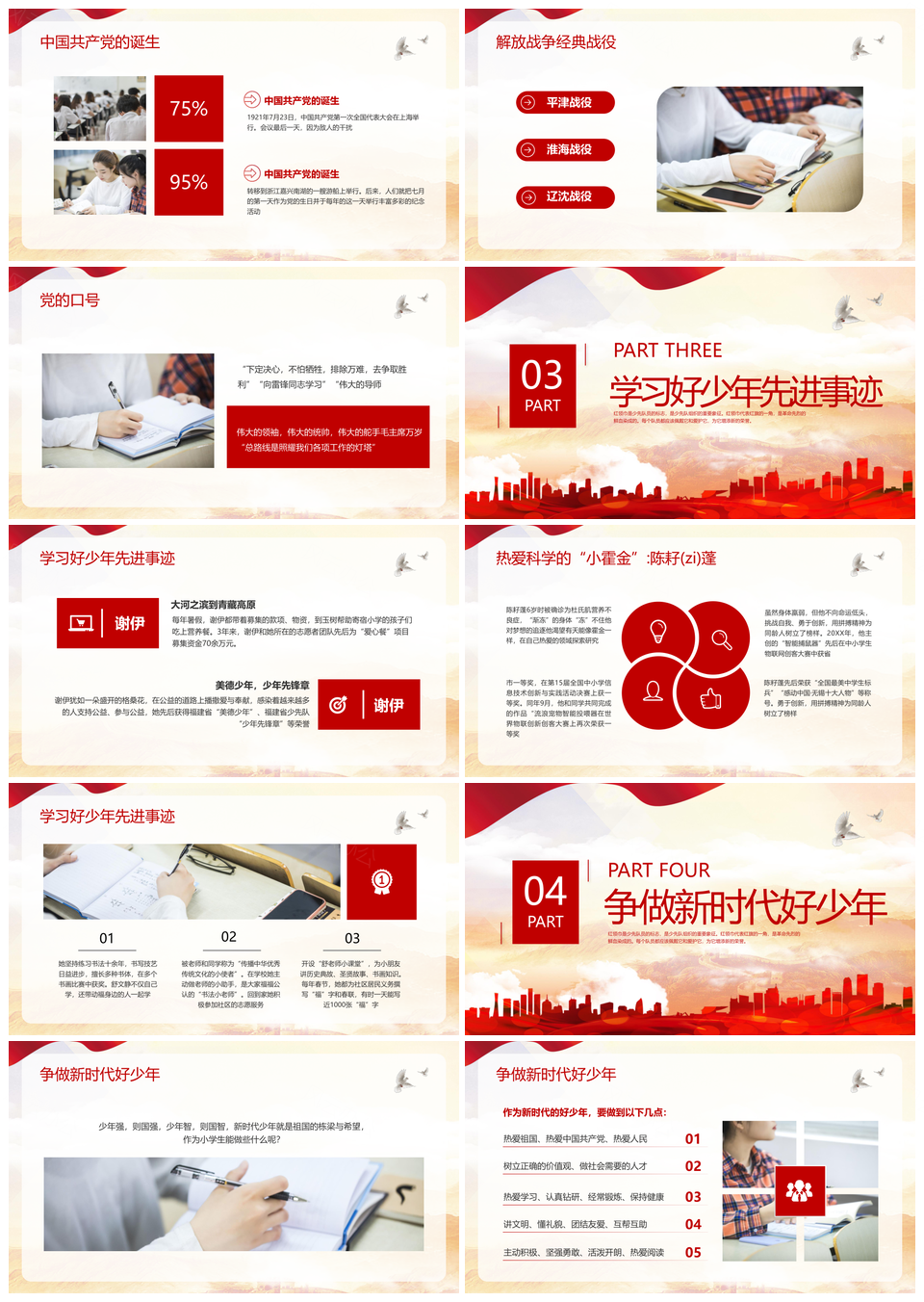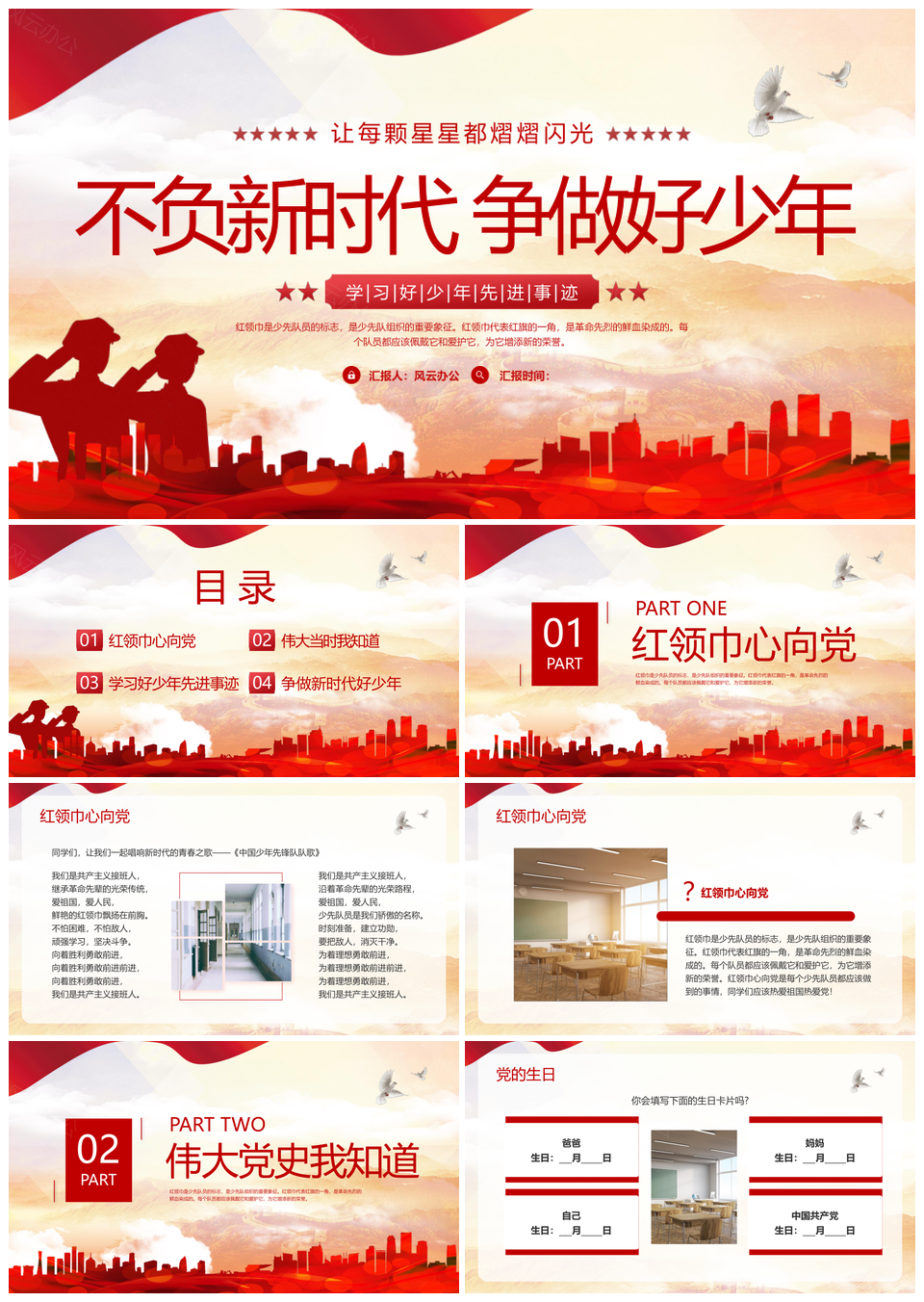 风云办公提供的红色简约新时代好少年宣传动态PPT模板,下载格式为pptx,一共18页,作品中文字及图均可以修改和编辑,图片更改请在作品中右键图片并更换,文字修改请直接点击文字进行修改。
