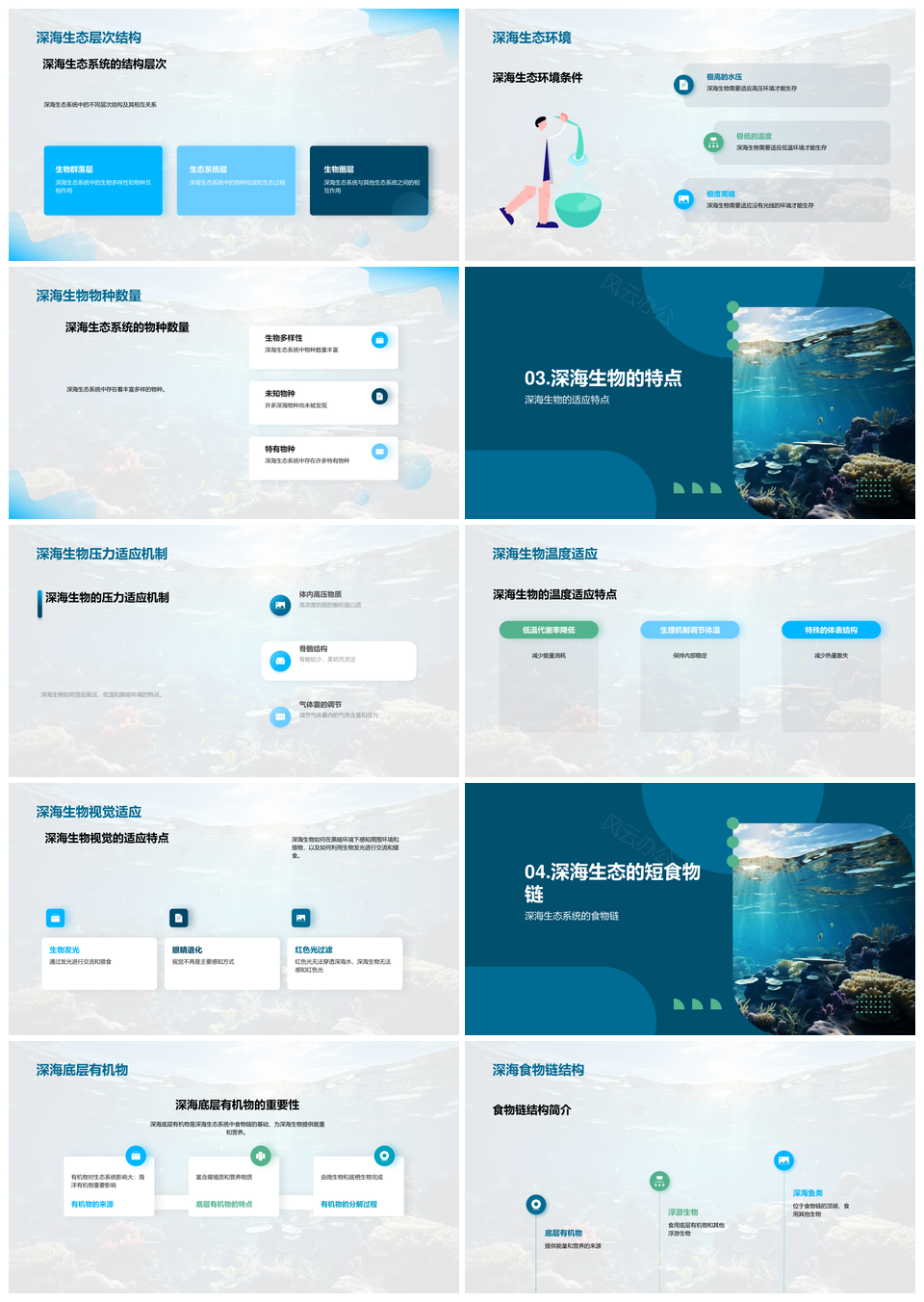 风云办公提供的深海生物适应发光师生教育培训探秘PPT模板,下载格式为pptx,一共35页,作品中文字及图均可以修改和编辑,图片更改请在作品中右键图片并更换,文字修改请直接点击文字进行修改。
