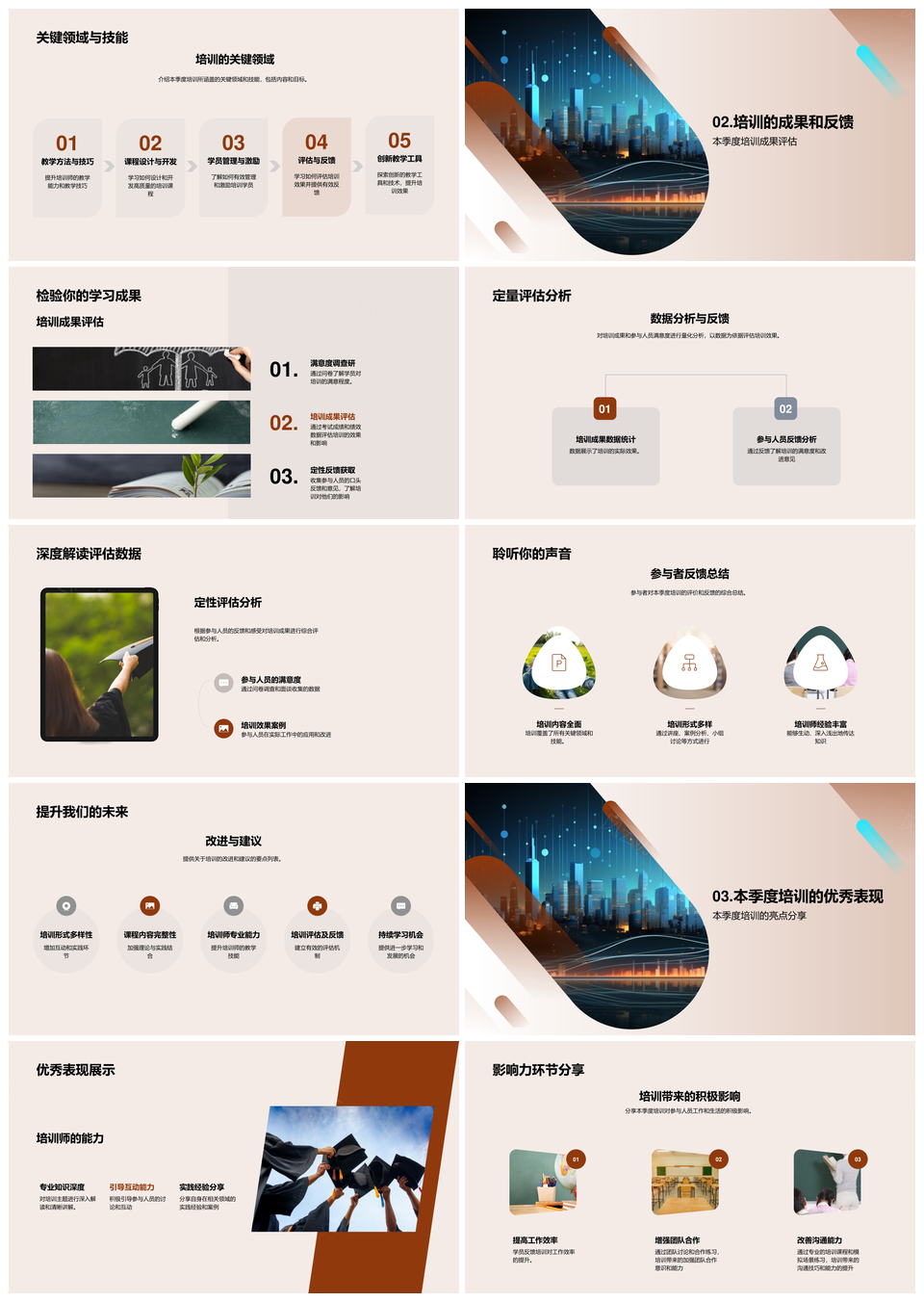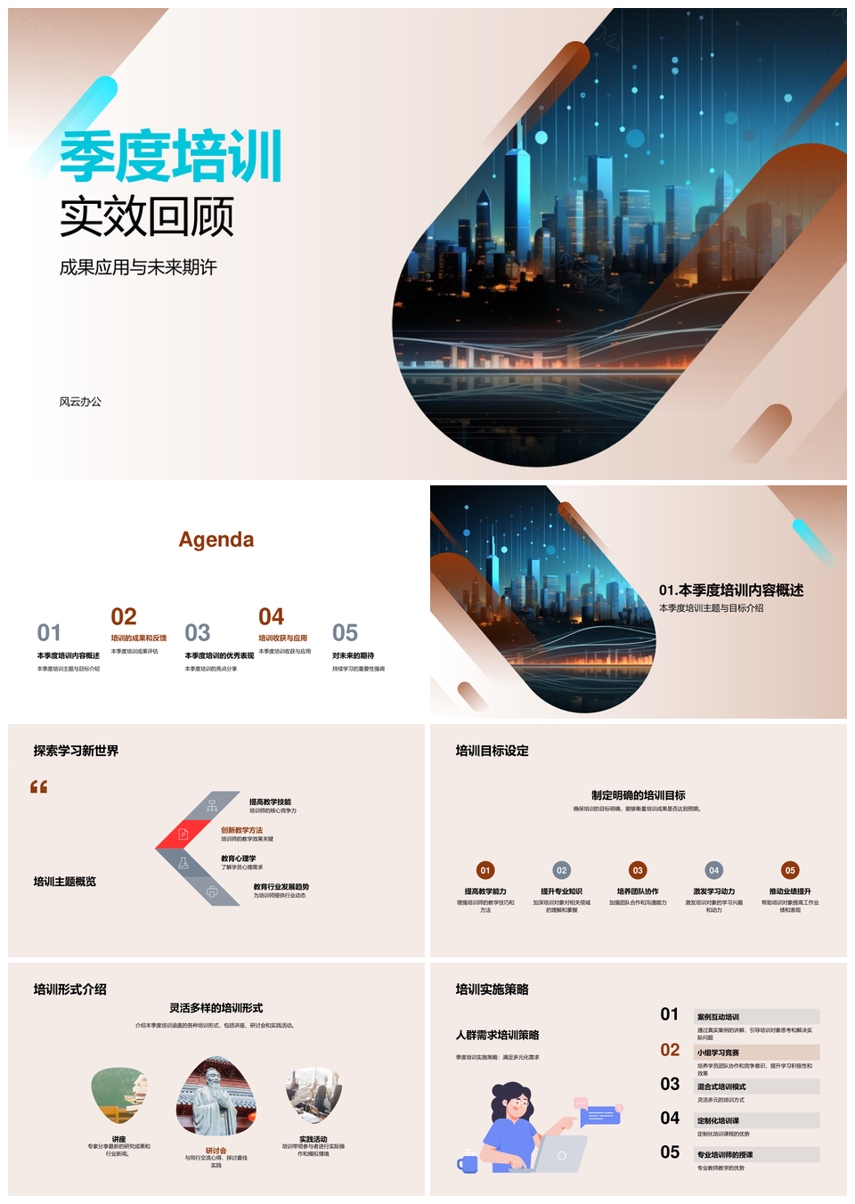 风云办公提供的季度培训实效成果应用与未来策略展望PPT模板,下载格式为pptx,一共33页,作品中文字及图均可以修改和编辑,图片更改请在作品中右键图片并更换,文字修改请直接点击文字进行修改。