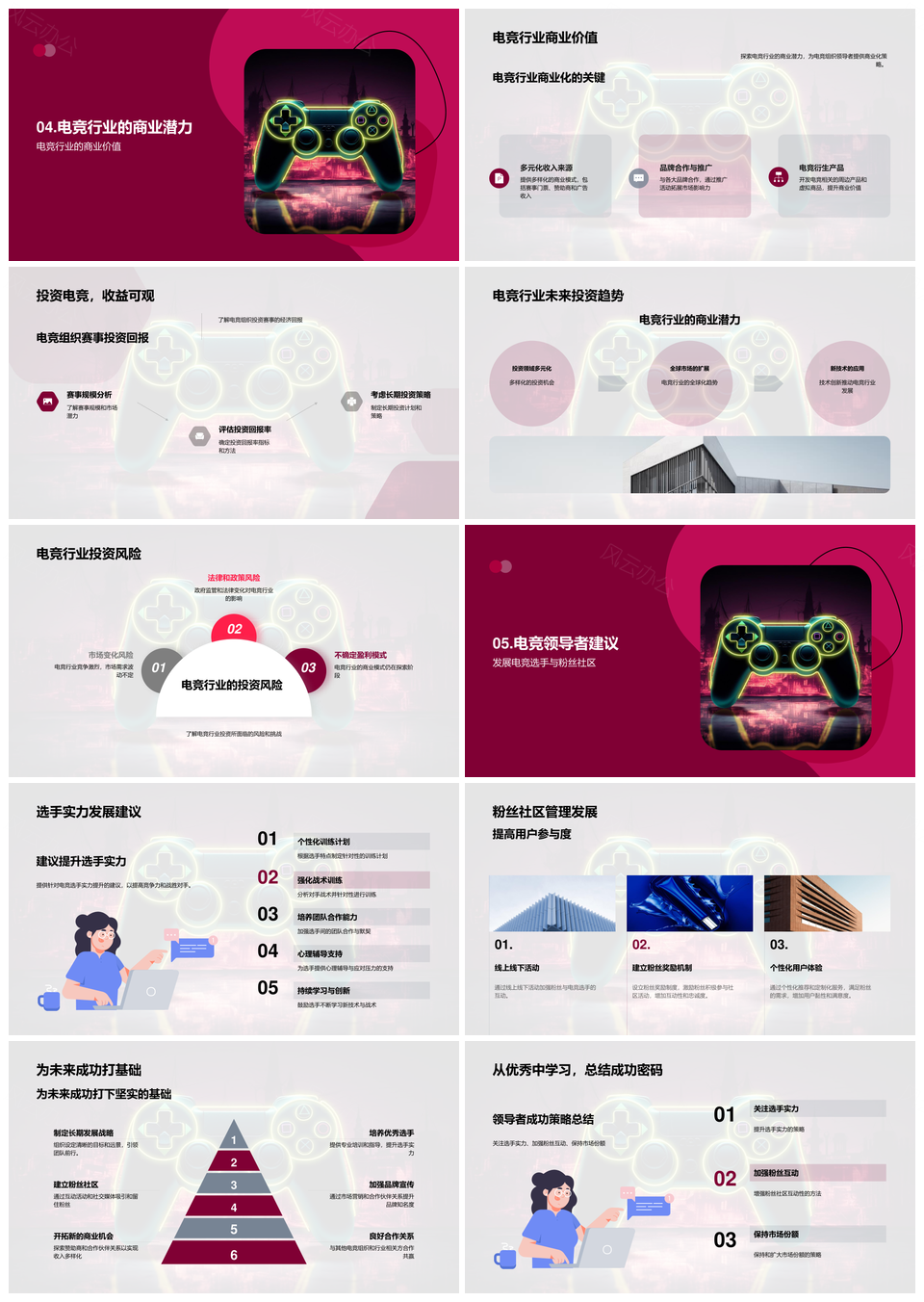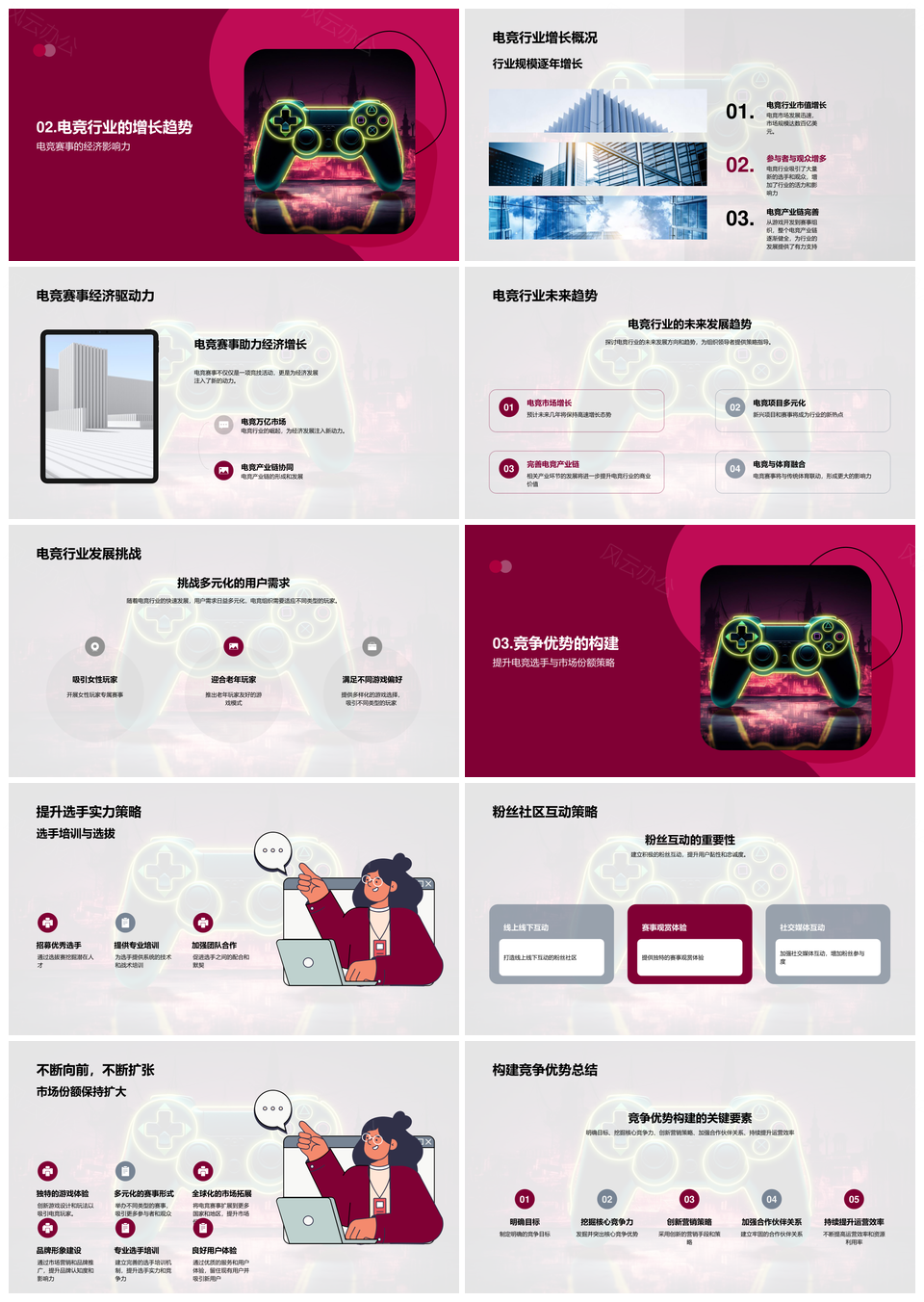 这是一张电竞市场趋势领军策略选手粉丝互动发展PPT模板,包含电竞、市场、趋势、领军、策略、选手、粉丝、互动、发展等主题内容,也可用作电竞市场趋势领军、市场趋势领军策略、趋势领军策略选手、领军策略选手粉丝、策略选手粉丝互动、选手粉丝互动发展、电竞市场趋势、市场趋势领军、趋势领军策略、领军策略选手、策略选手粉丝、选手粉丝互动、粉丝互动发展、电竞市场、市场趋势等PPT场景使用。 风云办公提供的电竞市场趋势领军策略选手粉丝互动发展PPT模板,下载格式为pptx,一共28页,作品中文字及图均可以修改和编辑,图片更改请在作品中右键图片并更换,文字修改请直接点击文字进行修改。