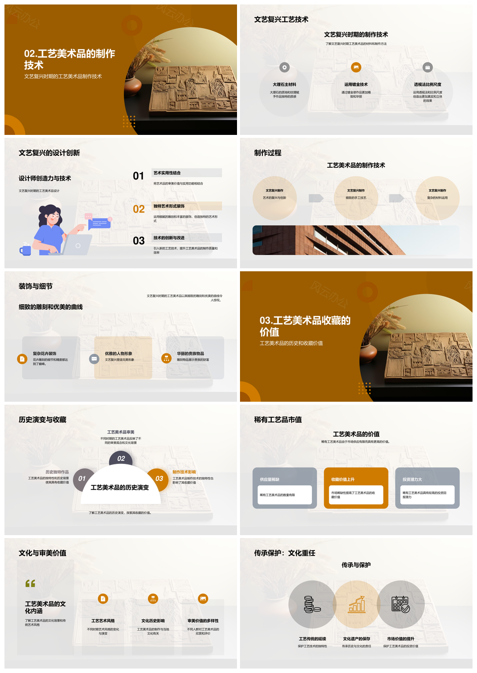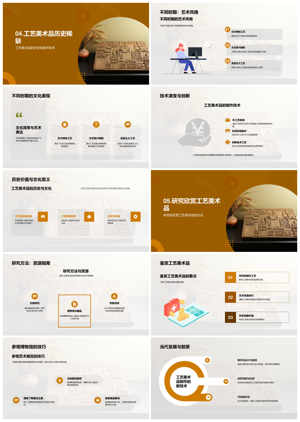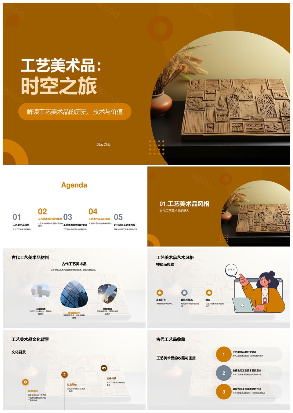 风云办公提供的工艺美术品艺术风格与技术演变史PPT模板,下载格式为pptx,一共28页,作品中文字及图均可以修改和编辑,图片更改请在作品中右键图片并更换,文字修改请直接点击文字进行修改。