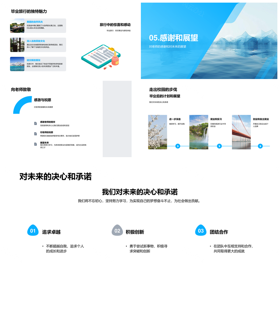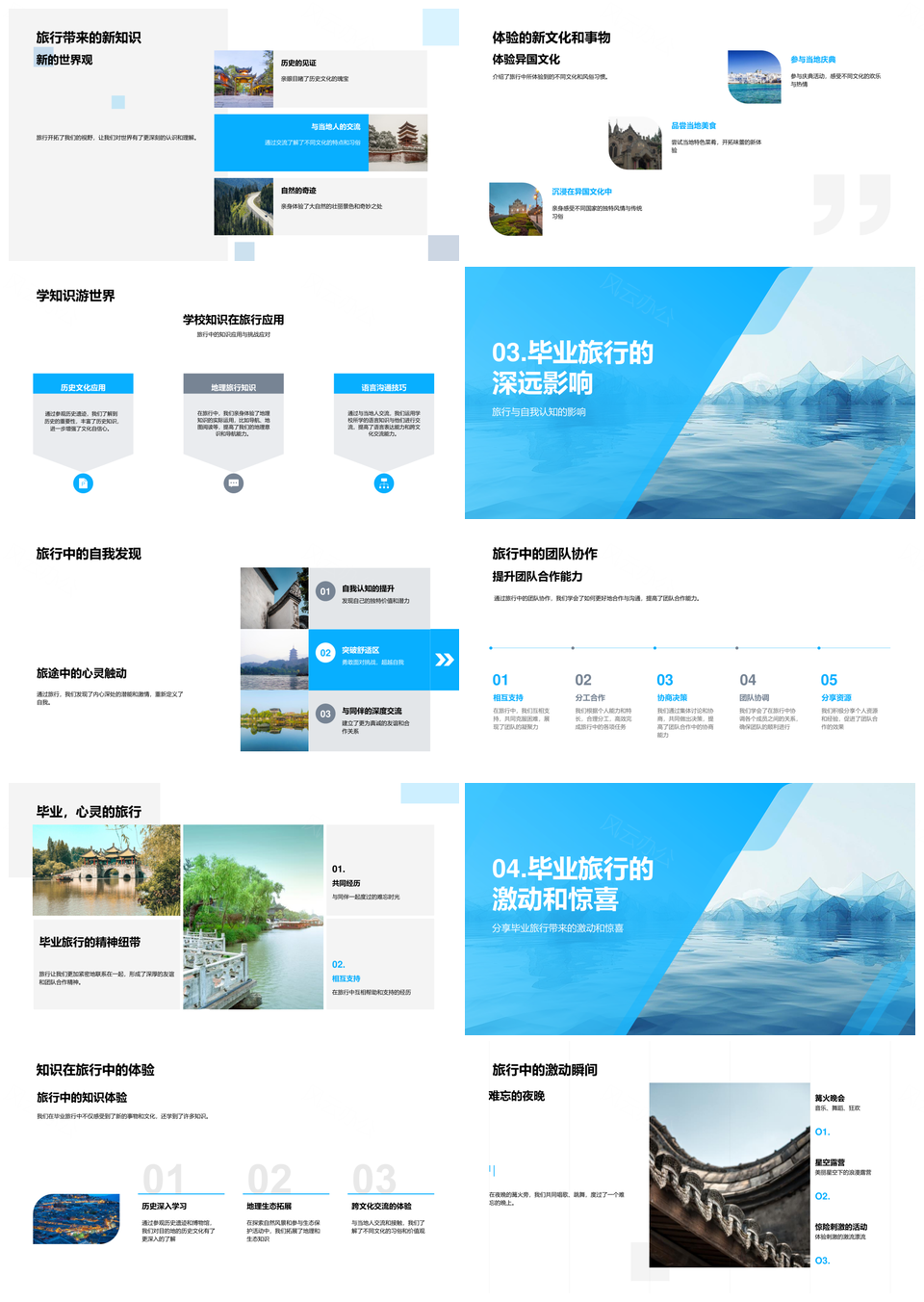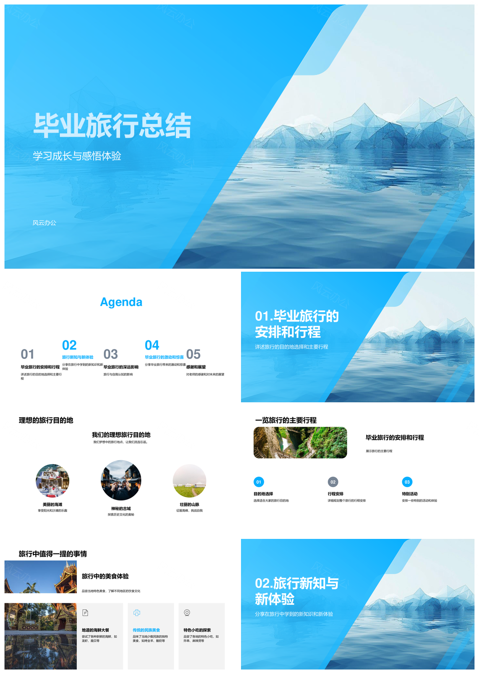风云办公提供的毕业旅行总结行程新知协作与未来展望PPT模板,下载格式为pptx,一共23页,作品中文字及图均可以修改和编辑,图片更改请在作品中右键图片并更换,文字修改请直接点击文字进行修改。