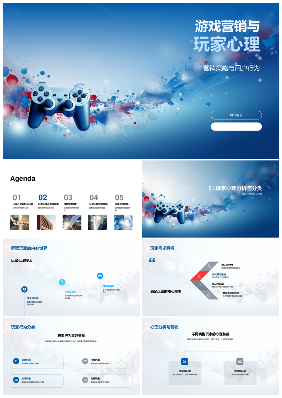 风云办公提供的游戏营销策略与玩家心理行为优化PPT模板,下载格式为pptx,一共28页,作品中文字及图均可以修改和编辑,图片更改请在作品中右键图片并更换,文字修改请直接点击文字进行修改。