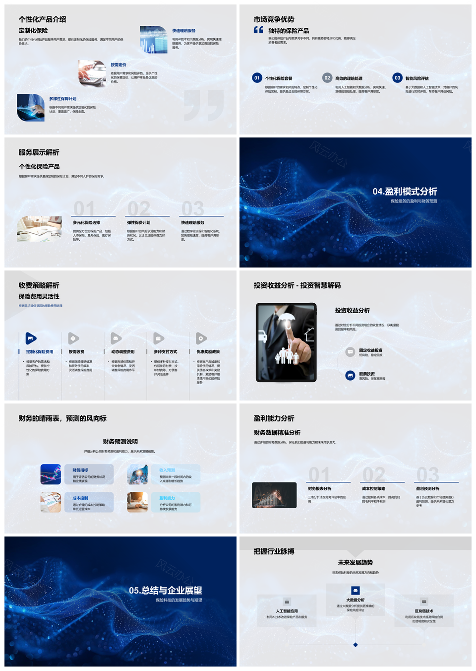 这是一张保险科技商业策划AI大数据革新趋势挑战财务预测盈利PPT模板,包含保险科技、商业策划、AI、大数据、革新趋势、挑战、财务预测、盈利等主题内容,也可用作保险科技商业策划AI大数据、商业策划AI大数据革新趋势、AI大数据革新趋势挑战、大数据革新趋势挑战财务预测、革新趋势挑战财务预测盈利、保险科技挑战财务预测、保险科技商业策划AI、商业策划财务预测盈利、挑战财务预测盈利、AI大数据革新趋势、大数据革新趋势挑战、保险科技盈利、商业策划AI大数据、革新趋势财务预测、财务预测盈利等PPT场景使用。 风云办公提供的保险科技商业策划AI大数据革新趋势挑战财务预测盈利PPT模板,下载格式为pptx,一共32页,作品中文字及图均可以修改和编辑,图片更改请在作品中右键图片并更换,文字修改请直接点击文字进行修改。