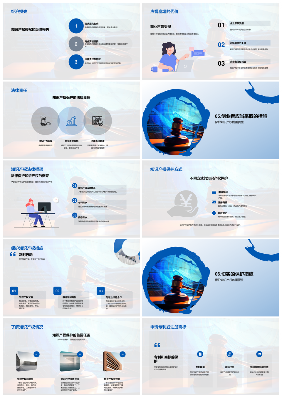 这是一张法律行业知识产权律师护创业者专利商标PPT模板,包含法律行业、知识产权、律师、护、创业者、专利、商标等主题内容,也可用作法律行业知识产权律师创业者、知识产权律师创业者专利、律师创业者专利商标、法律行业创业者专利商标、法律行业知识产权律师、知识产权律师专利商标、创业者专利商标律师、法律行业知识产权专利、知识产权律师创业者、创业者专利商标、律师专利商标、法律行业专利商标、法律行业知识产权、知识产权律师、创业者专利等PPT场景使用。 风云办公提供的法律行业知识产权律师护创业者专利商标PPT模板,下载格式为pptx,一共30页,作品中文字及图均可以修改和编辑,图片更改请在作品中右键图片并更换,文字修改请直接点击文字进行修改。