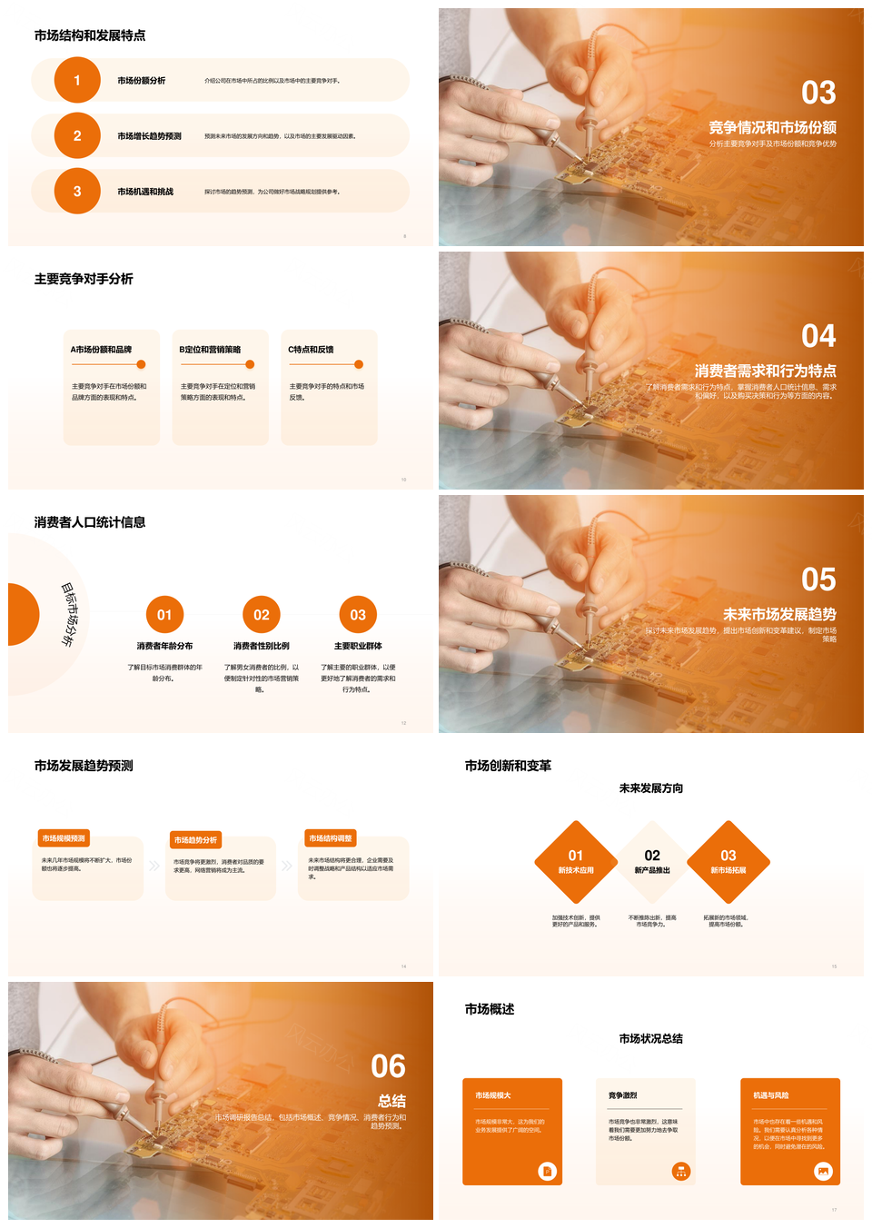 该模板以橙色为主视觉基调,融入智能科技元素,适用于IT、互联网行业研究报告及市场分析场景。采用现代感几何波型与抽象激光光束穿插设计,通过渐变色块及数据光效增强视觉逻辑性。内置模块化架构支持自由重组,涵盖技术趋势图解、市场数据可视化、项目路径推演等深度场景。基于波粒二象性灵感开发的动态转场样式,适配量子计算、光学研究等前沿议题阐述。含10套专业级图标库及数据看板组件,兼容竞品分析、技术路线比对等复杂内容排版,确保信息密度与视觉层次平衡。