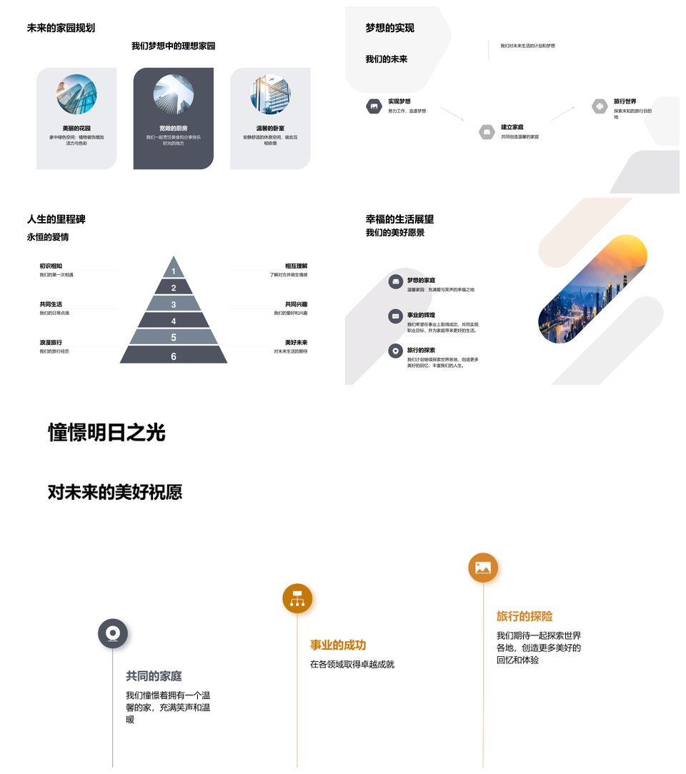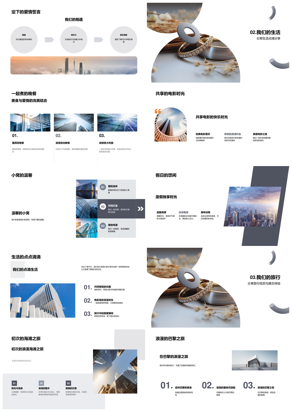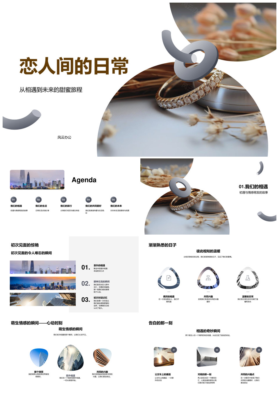 这是一张新婚夫妇初遇甜蜜旅程婚礼婚戒爱情相册PPT模板,包含新婚夫妇、初遇、甜蜜旅程、婚礼、婚戒、爱情相册等主题内容,也可用作新婚夫妇初遇甜蜜旅程、初遇甜蜜旅程婚礼、甜蜜旅程婚礼婚戒、旅程婚礼婚戒爱情、婚礼婚戒爱情相册、新婚夫妇初遇甜蜜、初遇甜蜜旅程、甜蜜旅程婚礼、旅程婚礼婚戒、婚礼婚戒爱情、婚戒爱情相册、新婚夫妇婚礼婚戒、婚礼婚戒、甜蜜旅程、爱情相册等PPT场景使用。 风云办公提供的新婚夫妇初遇甜蜜旅程婚礼婚戒爱情相册PPT模板,下载格式为pptx,一共33页,作品中文字及图均可以修改和编辑,图片更改请在作品中右键图片并更换,文字修改请直接点击文字进行修改。